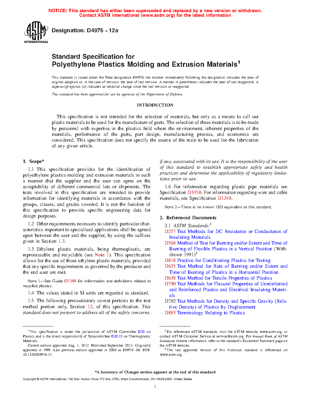 1.3 Ethylene plastic materials, being thermoplastic, are reprocessable and recyclable (see Note 1). This specification allows for the use of those ethylene plastic materials, provided that any specific requirements as governed by the producer and the end user are met.