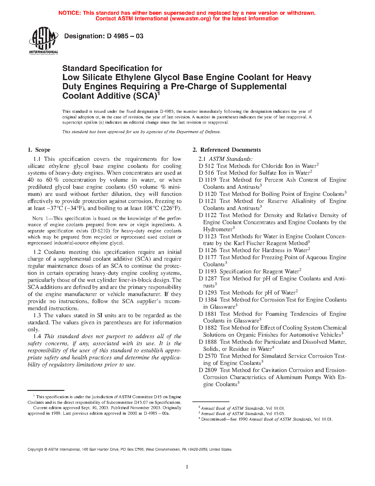 1.2 Coolants meeting this specification require an initial charge of a supplemental coolant additive (SCA) and require regular maintenance doses of an SCA to continue the protection in certain operating heavy-duty engine cooling systems, particularly those of the wet cylinder liner-in-block design. The SCA additions are defined by and are the primary responsibility of the engine manufacturer or vehicle manufacturer. If they provide no instructions, follow the SCA supplier's recommended instructions.