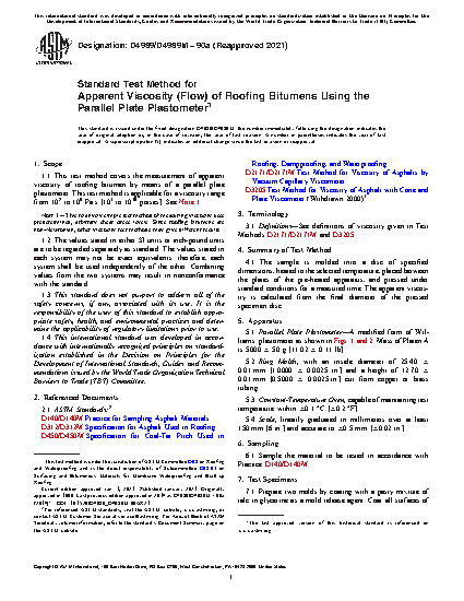 This test method deals with the standards for the measurement of apparent viscosity of roofing bitumen by mean of a parallel plate plastometer. This method involves measuring viscosity using pre-determined arbitrary shear stress levels. The method involves molding the sample into a disc of specified dimensions, heating it to a selected temperature and placing it between the plates of a pre-heated apparatus and pressing under the standard conditions for a measured time.