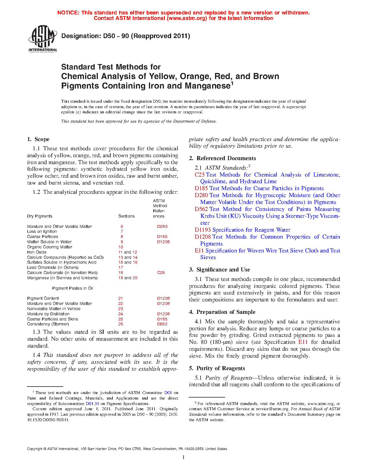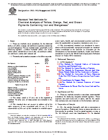 1.1 These test methods cover procedures for the chemical analysis of yellow, orange, red, and brown pigments containing iron and manganese. The test methods apply specifically to the following pigments: synthetic hydrated yellow iron oxide, yellow ocher, red and brown iron oxides, raw and burnt umber, raw and burnt sienna, and venetian red.