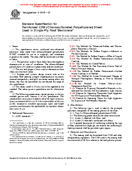 1.1 This specification covers reinforced non-vulcanized polymeric sheet made from chlorosulfonated polyethylene (CSM) (see Note 1 ) intended for use as a single-ply roof membrane exposed to the weather. The sheet shall be reinforced with fiber or fabric.