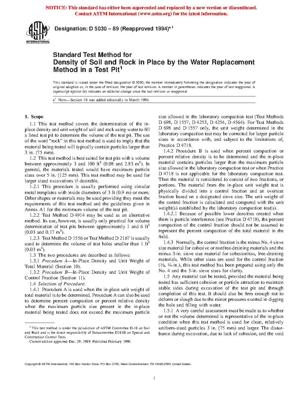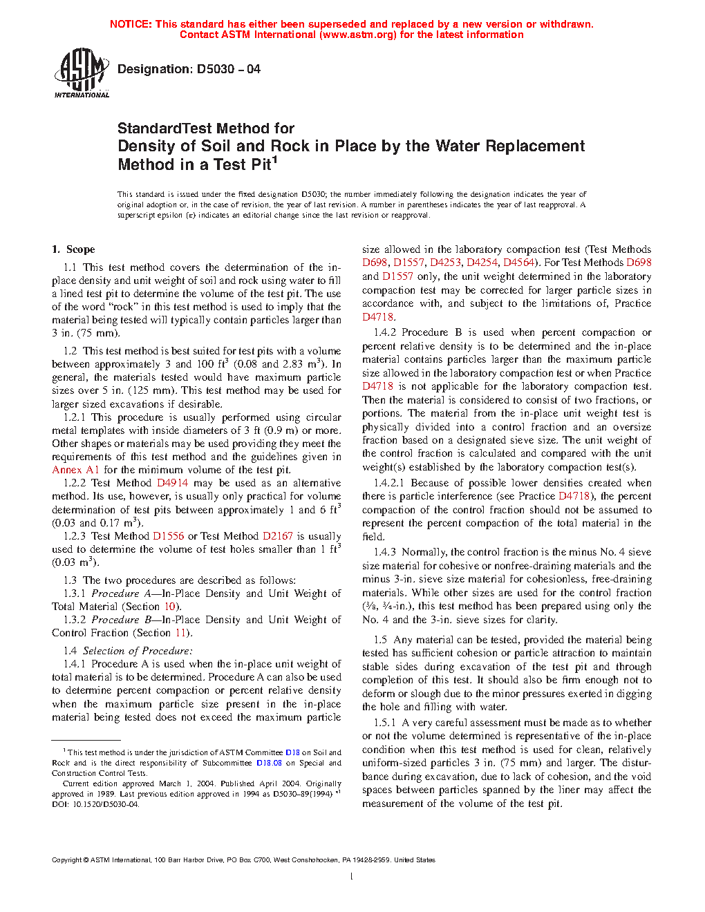 1.1 This test method covers the determination of the in-place density and unit weight of soil and rock using water to fill a lined test pit to determine the volume of the test pit. The use of the word "rock" in this test method is used to imply that the material being tested will typically contain particles larger than 3 in. (75 mm).