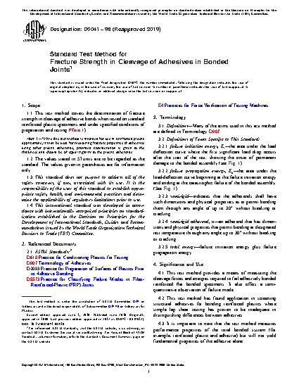 Note 1—While this test method is intended for use in reinforced plastic applications, it may be used for measuring fracture properties of adhesives using other plastic adherends, provided consideration is given to the thickness and should be of equal rigidity to the plastic adherends.