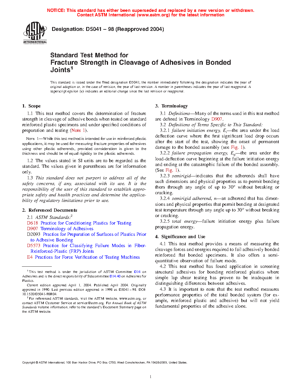 This test method provides a means of measuring the cleavage forces and energies required to fail adhesively bonded reinforced flat bonded specimens. It also offers a semi-quantitative observation of failure mode.