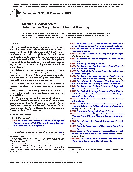 This specification establishes the dimensional (length and width, thickness, and weight) requirements for biaxially oriented polyethylene terephthalate film and sheeting, both virgin and recycled. For this specification, polyethylene terephthalate film and sheeting shall be defined as the material derived from terephthalic acid and ethylene glycol and shall consist of at least 90 % polyethylene terephthalate homopolymer. The film or sheeting shall be furnished flat or in rolls in the dimensions specified. This specification does not apply to coated, coextruded, tinted, pigmented, or metallized film or sheeting.