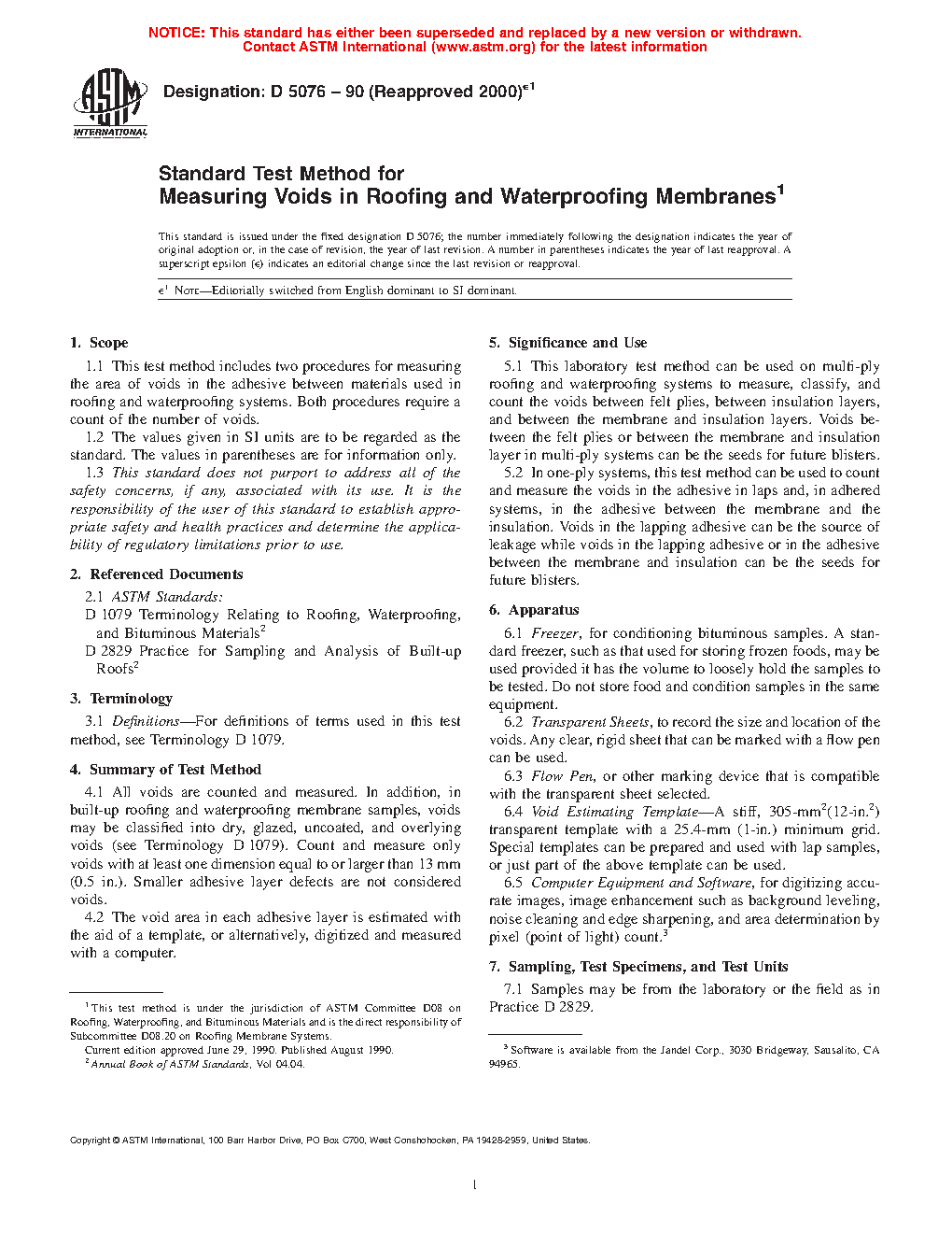 1.1 This test method includes two procedures for measuring the area of voids in the adhesive between materials used in roofing and waterproofing systems. Both procedures require a count of the number of voids.