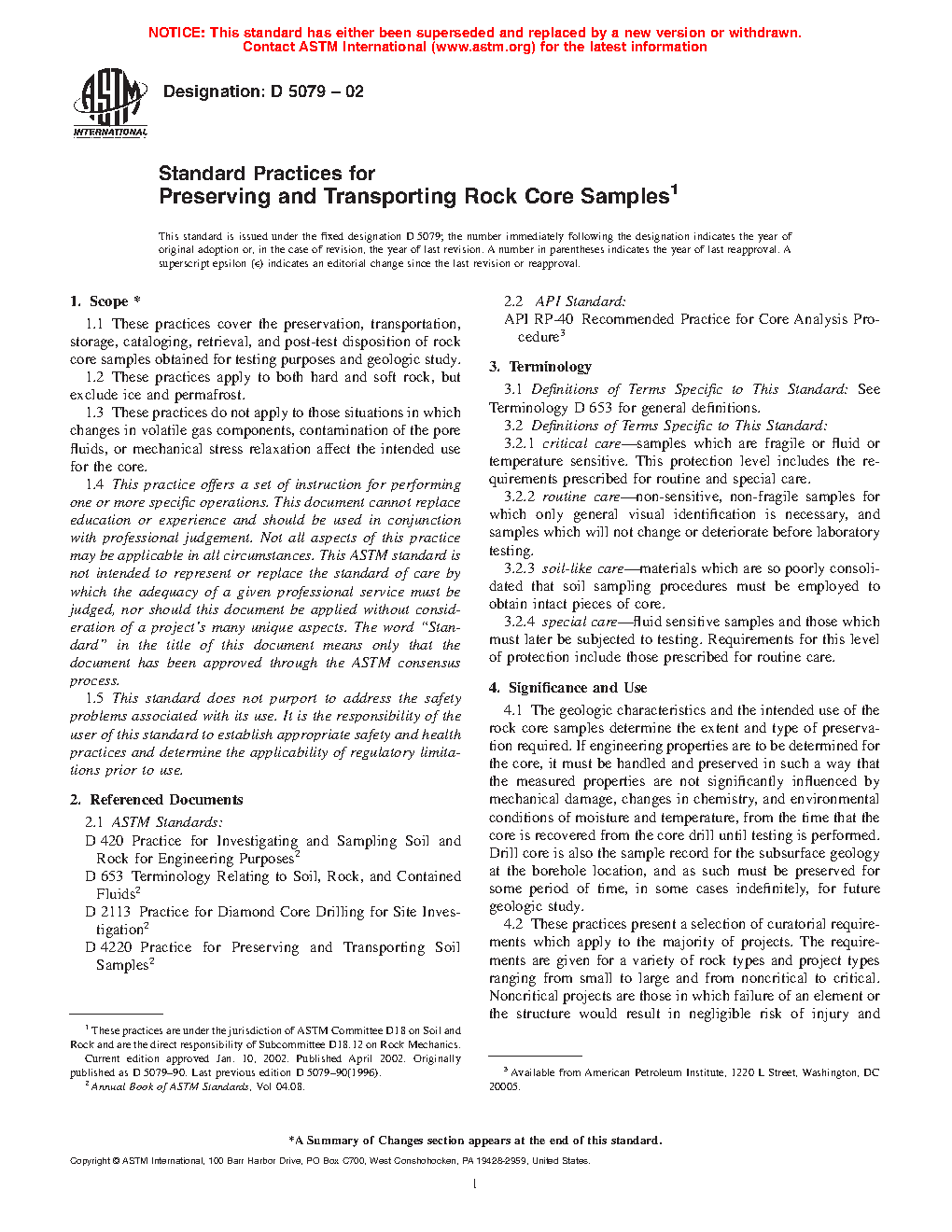 1.1 These practices cover the preservation, transportation, storage, cataloging, retrieval, and post-test disposition of rock core samples obtained for geotechnical site characterization, investigations, explorations, and design purposes including for use in visual classification and laboratory testing.