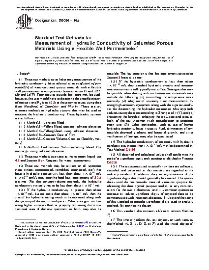 1.3 These test methods may be utilized on all specimen types (intact, reconstituted, remolded, compacted, etc.) that have a hydraulic conductivity less than about 1 × 10-6 m/s (1 × 10-4 cm/s), providing the head loss requirements of 5.2.3 are met. For the constant-volume methods, the hydraulic conductivity typically has to be less than about 1 × 10-7 m/s.