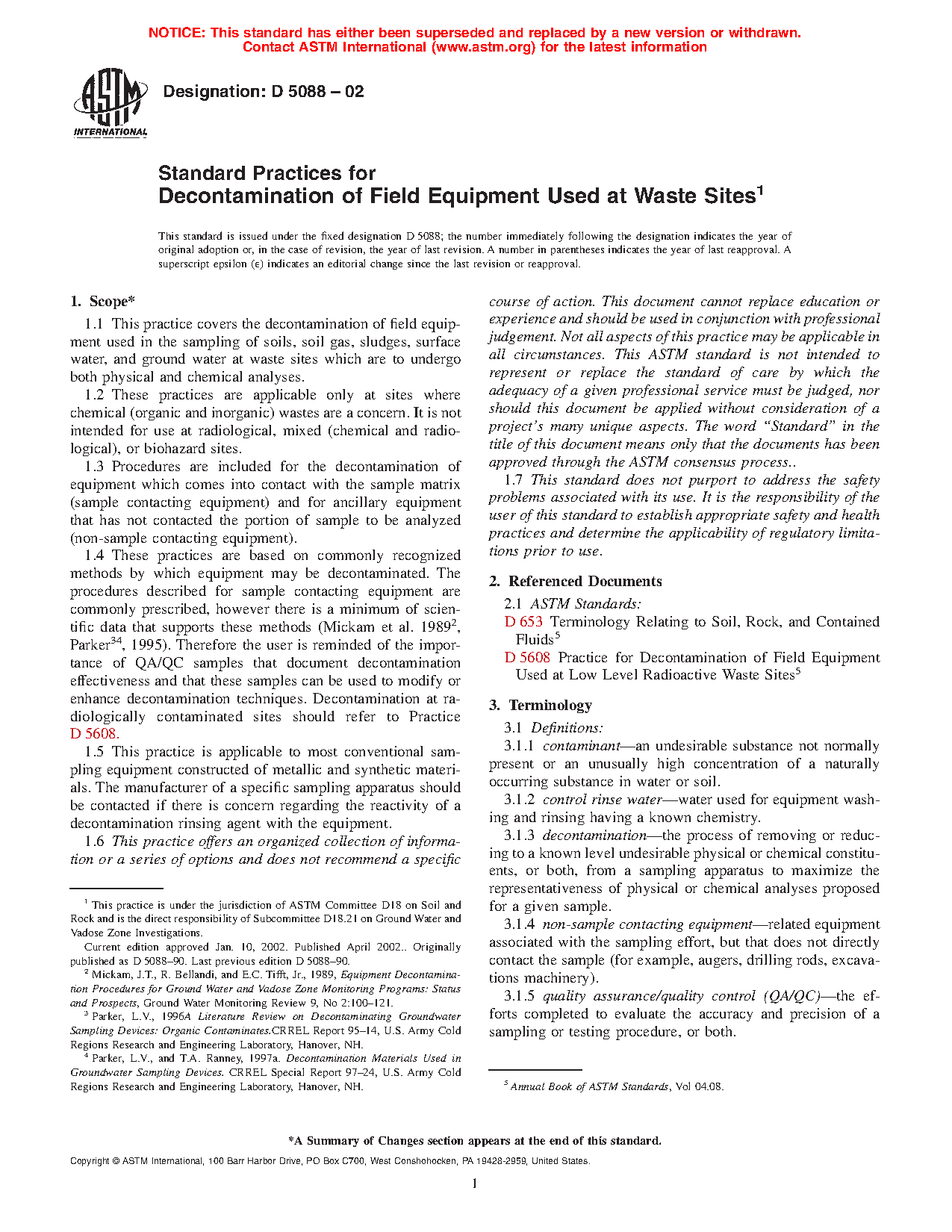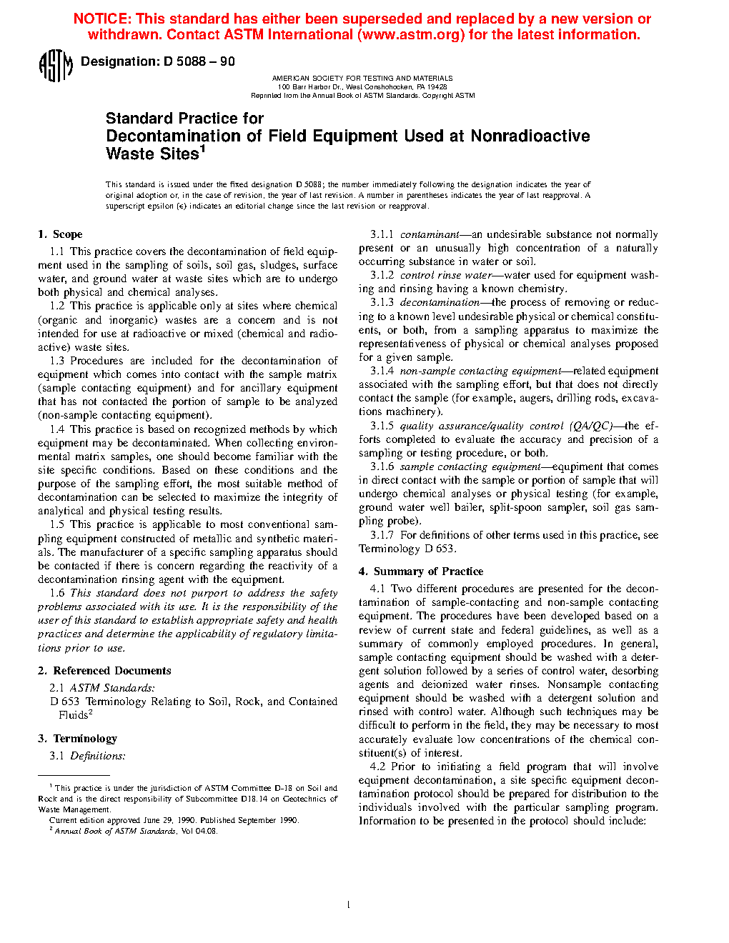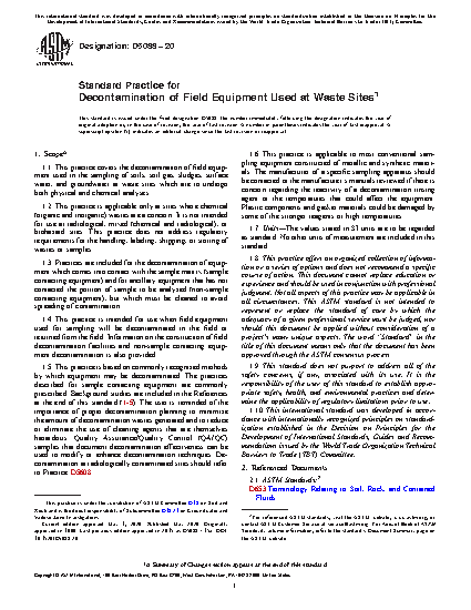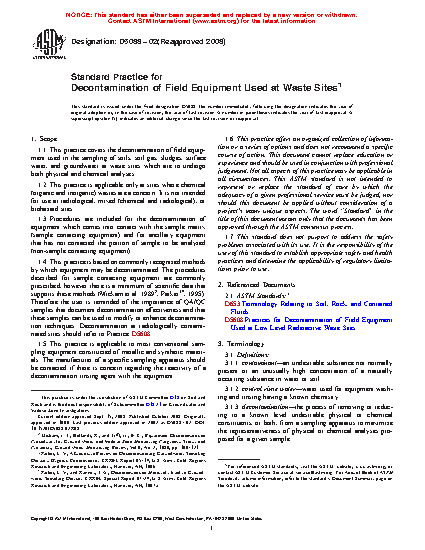 1.5 This practice is based on commonly recognized methods by which equipment may be decontaminated. The practices described for sample contacting equipment are commonly prescribed. Background studies are included in the References at the end of this standard (12345). The user is reminded of the importance of proper decontamination planning to minimize the amount of decontamination wastes generated and to reduce or eliminate the use of cleaning agents that are themselves hazardous. Quality Assurance/Quality Control (QA/QC) samples that document decontamination effectiveness can be used to modify or enhance decontamination techniques. Decontamination at radiologically contaminated sites should refer to Practice D5608.