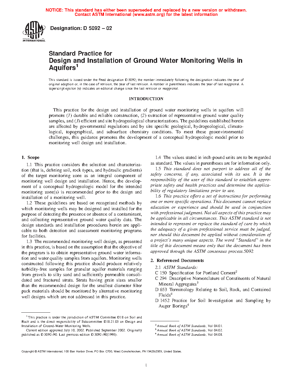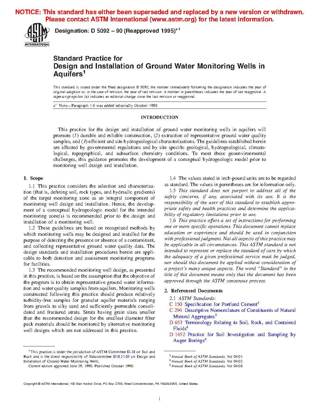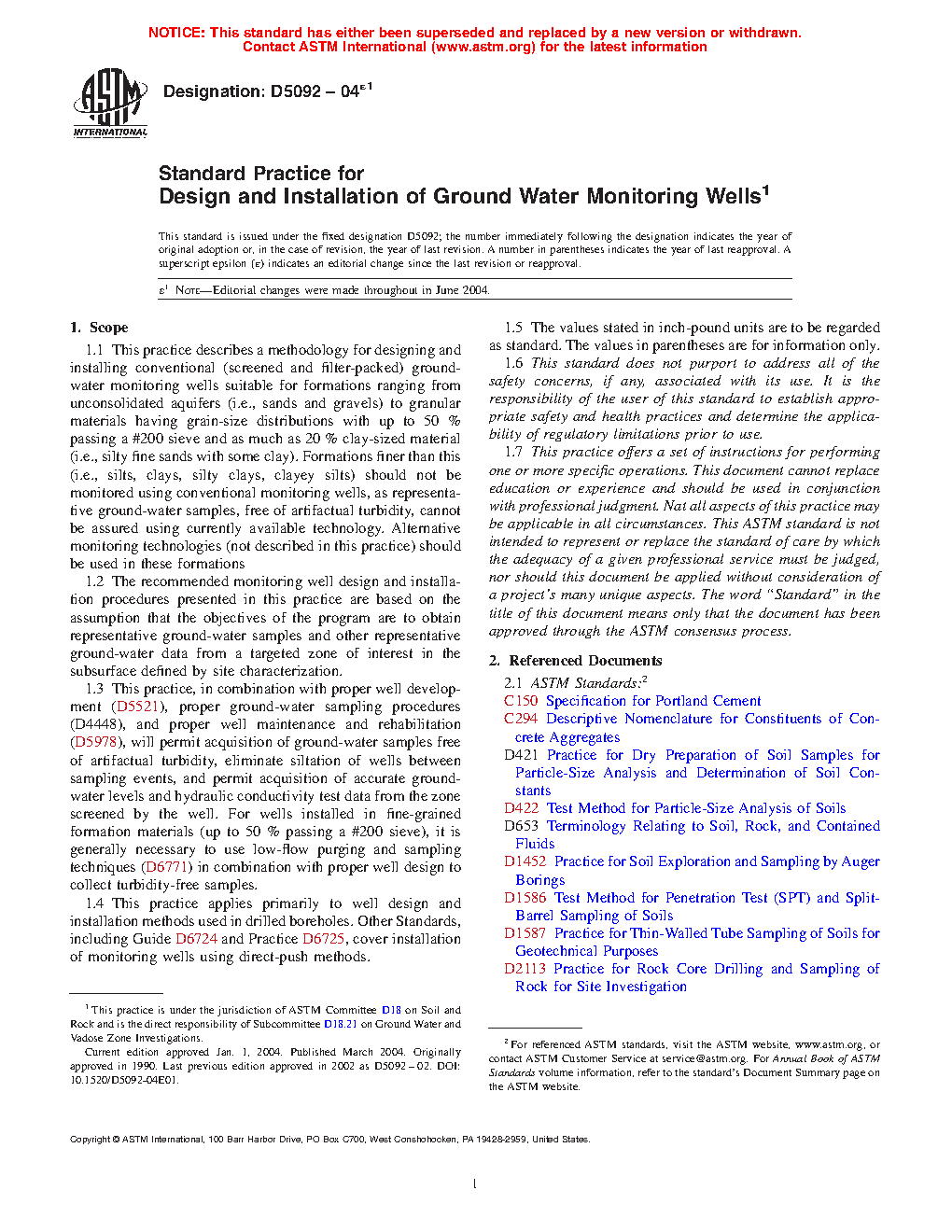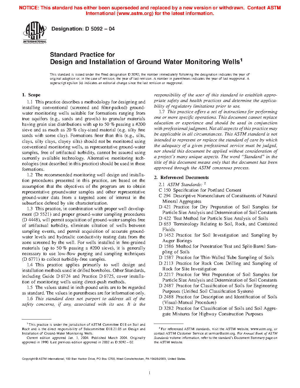 1.4 This practice applies primarily to well design and installation methods used in drilled boreholes. Other Standards, including Guide D6724 and Practice D6725, cover installation of monitoring wells using direct-push methods.