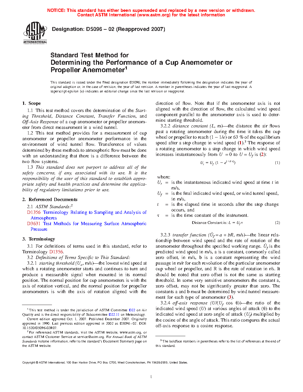 1.2 This test method provides for a measurement of cup anemometer or propeller anemometer performance in the environment of wind tunnel airflow. Transference of values determined by these methods to atmospheric flow must be done with an understanding that there is a difference between the two flow systems.
