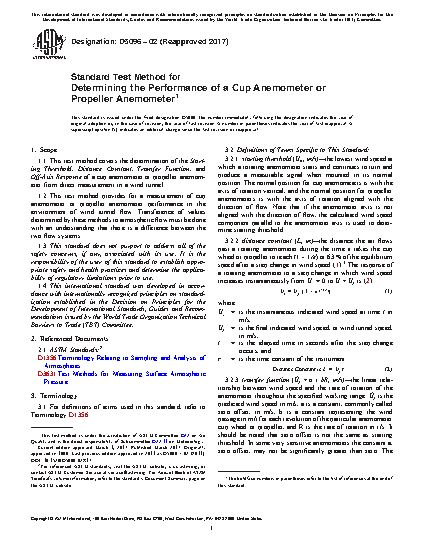 5.1 This test method provides a standard for comparison of rotating type anemometers, specifically cup anemometers and propeller anemometers, of different types. Specifications by regulatory agencies (4-7) and industrial societies have specified performance values. This standard provides an unambiguous method for measuring starting threshold, distance constant, transfer function, and off-axis response.