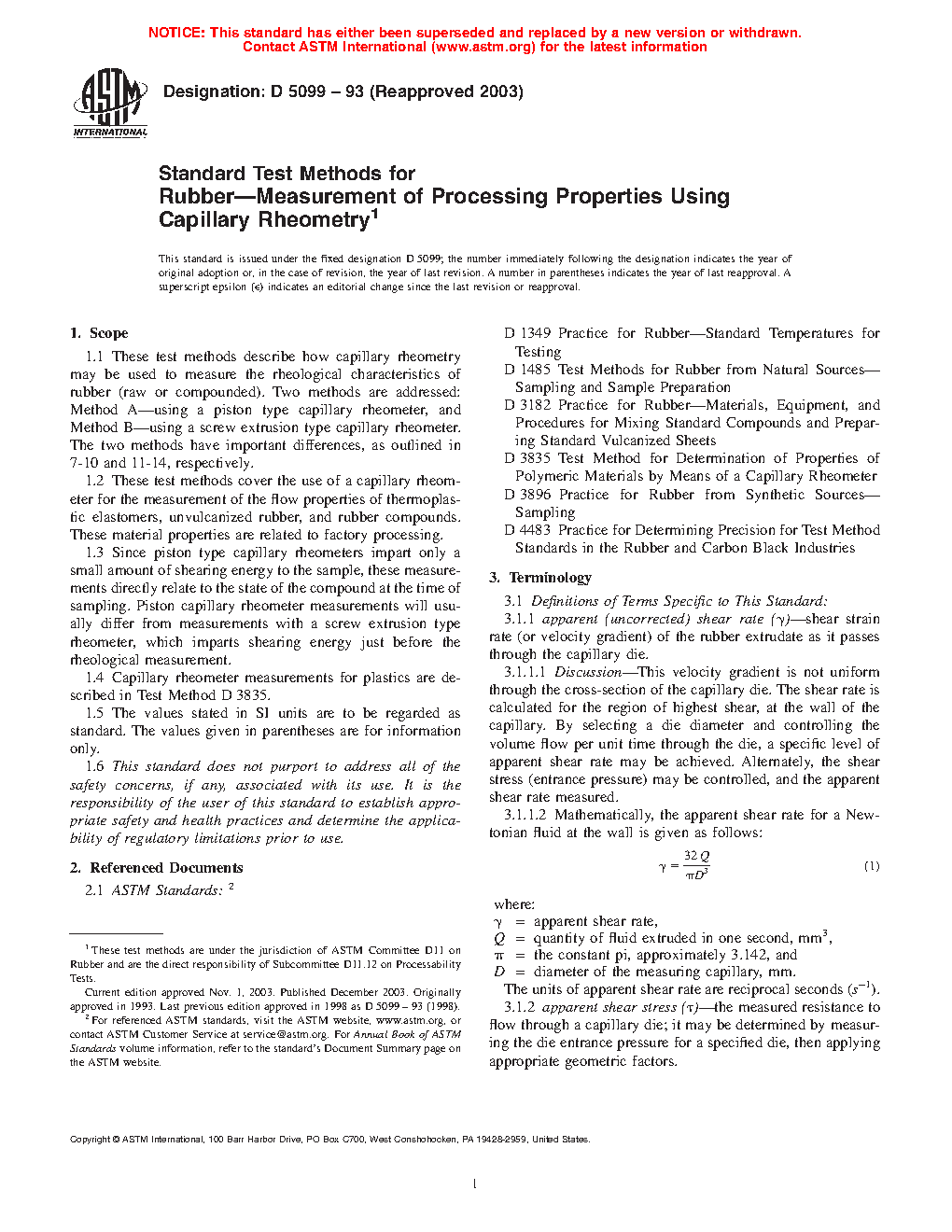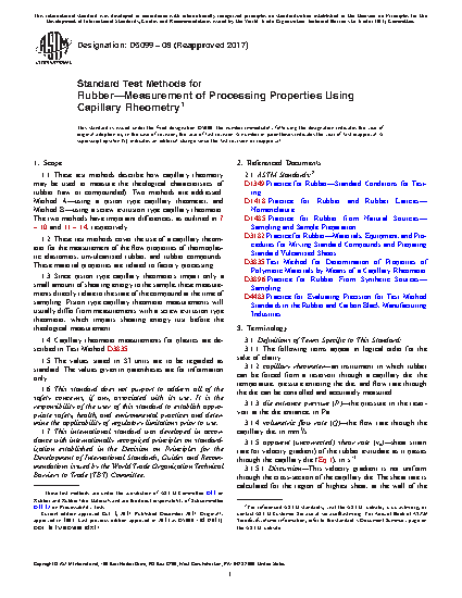 1.1 These test methods describe how capillary rheometry may be used to measure the rheological characteristics of rubber (raw or compounded). Two methods are addressed: Method A—using a piston type capillary rheometer, and Method B—using a screw extrusion type capillary rheometer. The two methods have important differences, as outlined in 7 – 10 and 11 – 14, respectively.