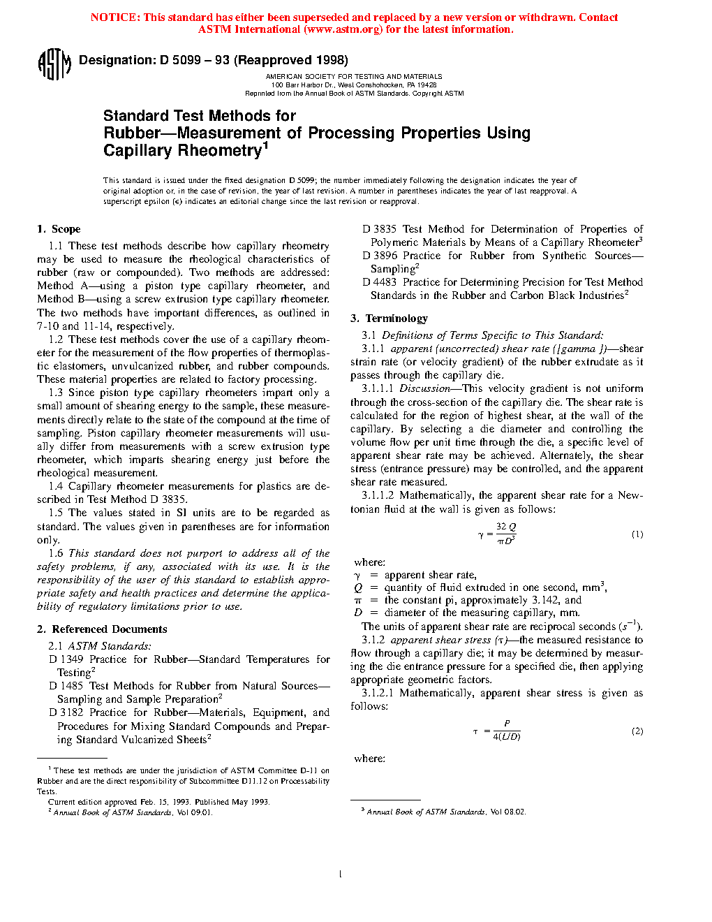 1.2 These test methods cover the use of a capillary rheometer for the measurement of the flow properties of thermoplastic elastomers, unvulcanized rubber, and rubber compounds. These material properties are related to factory processing.