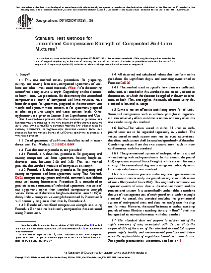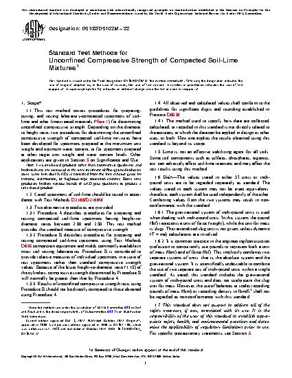 1.1 This test method covers procedures for preparing, curing, and testing laboratory-compacted specimens of soil-lime and other lime-treated materials (Note 1) for determining unconfined compressive strength. Depending on the diameter to height ratio, two procedures for determining the unconfined compressive strength of compacted soil-lime mixtures have been developed for specimens prepared at the maximum unit weight and optimum water content, or for specimens prepared at other target unit weight and water content levels. Other applications are given in Section 5 on Significance and Use.