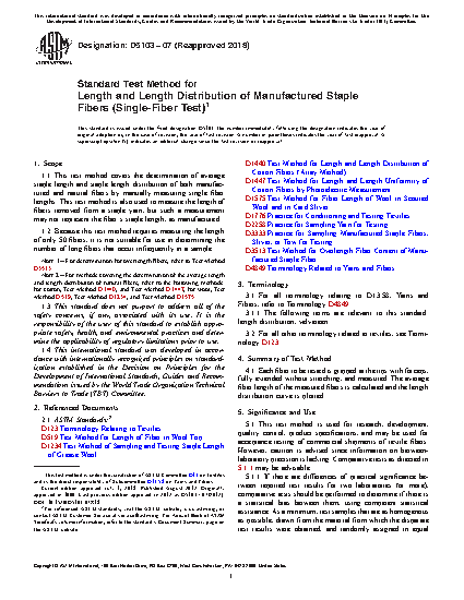 1.1 This test method covers the determination of average staple length and staple length distribution of both manufactured and natural fibers by manually measuring single fiber lengths. This test method is also used to measure the length of fibers removed from a staple yarn, but such a measurement may not represent the fiber's staple length, as manufactured.