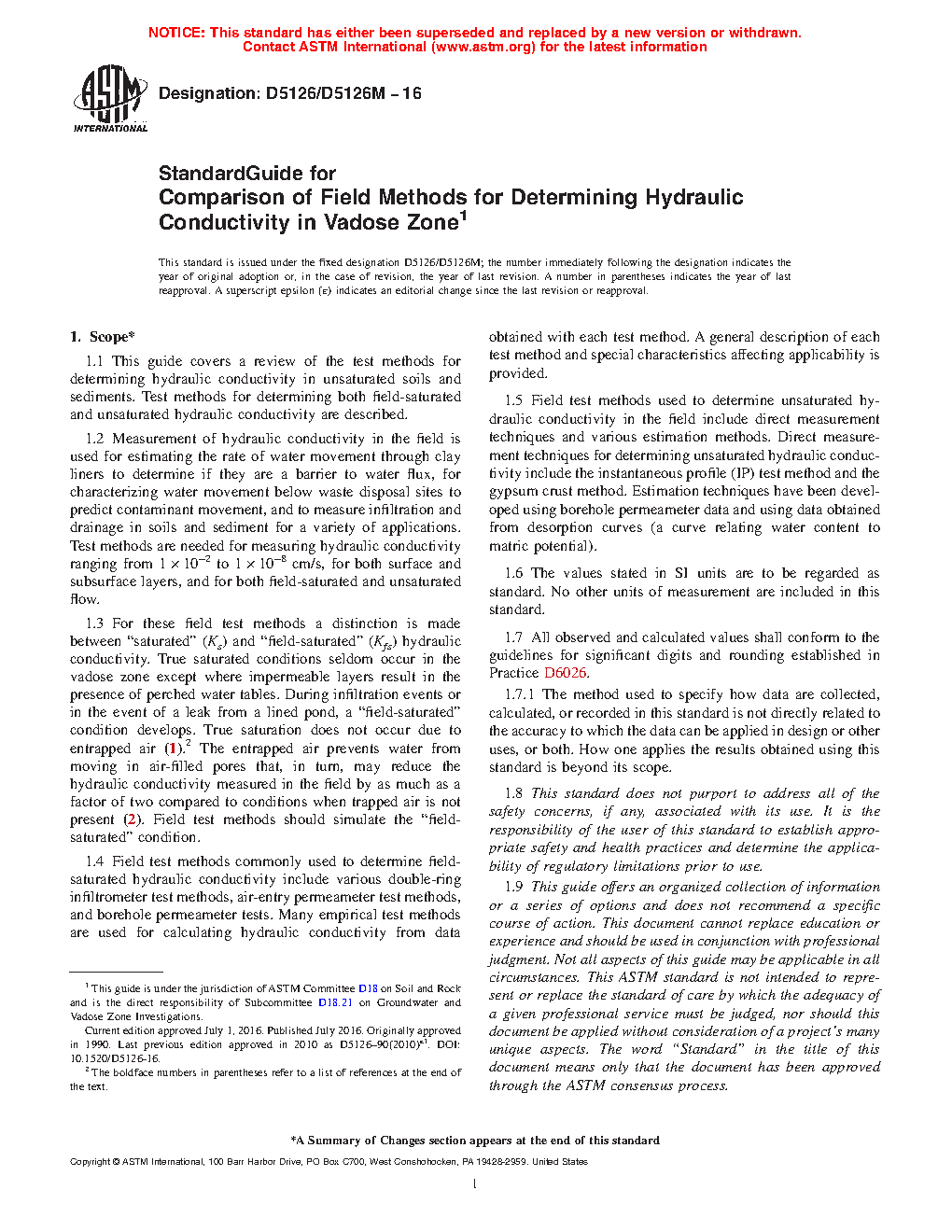 1.1 This guide covers a review of the test methods for determining hydraulic conductivity in unsaturated soils and sediments. Test methods for determining both field-saturated and unsaturated hydraulic conductivity are described.