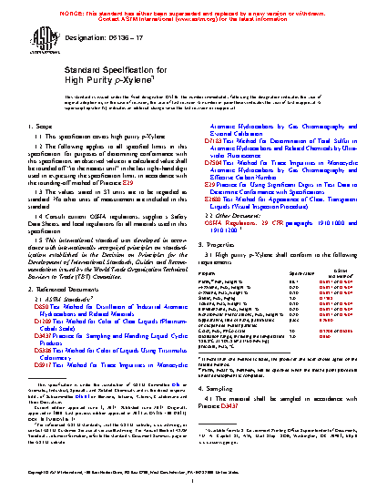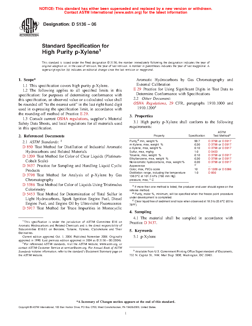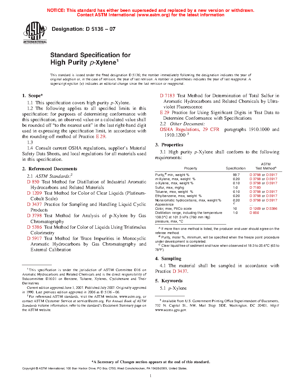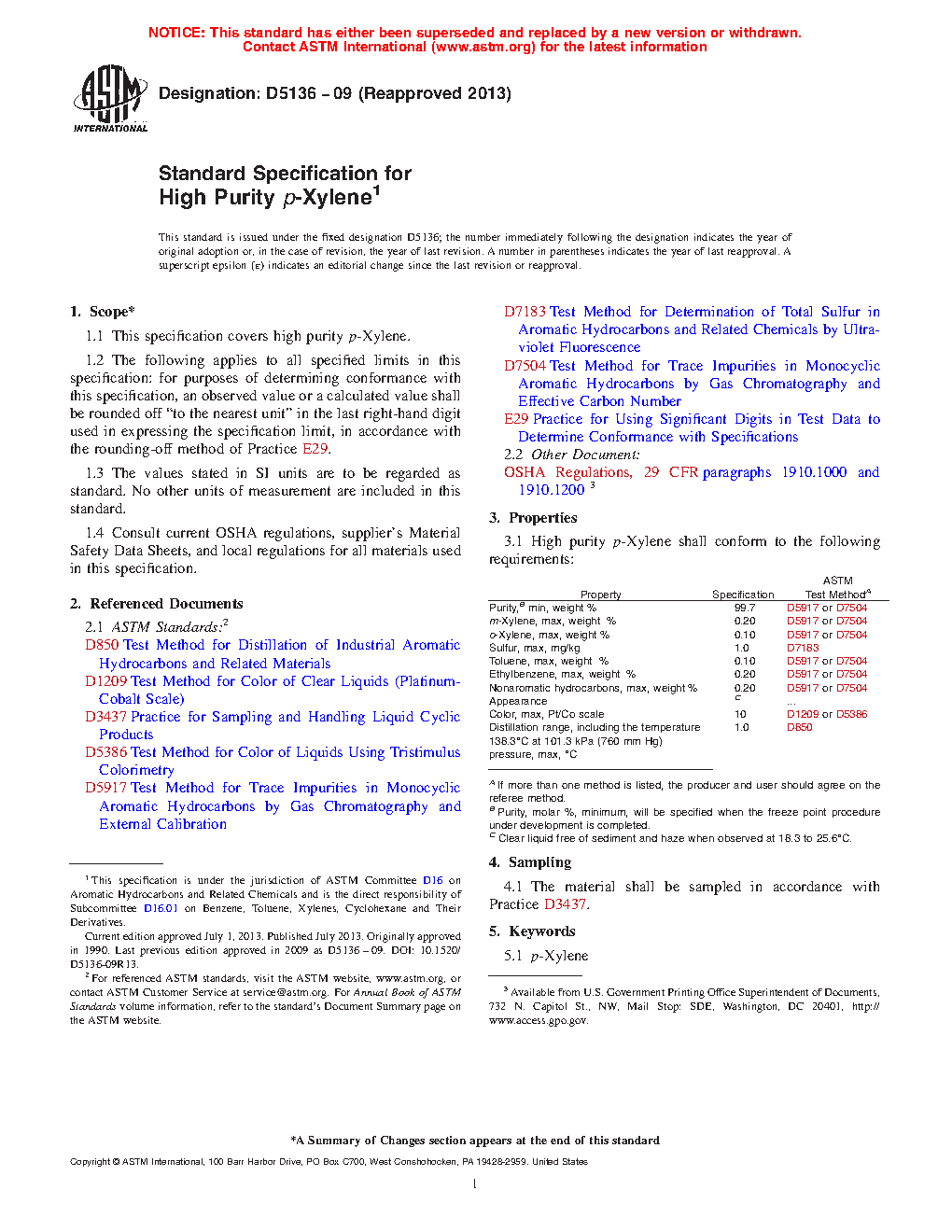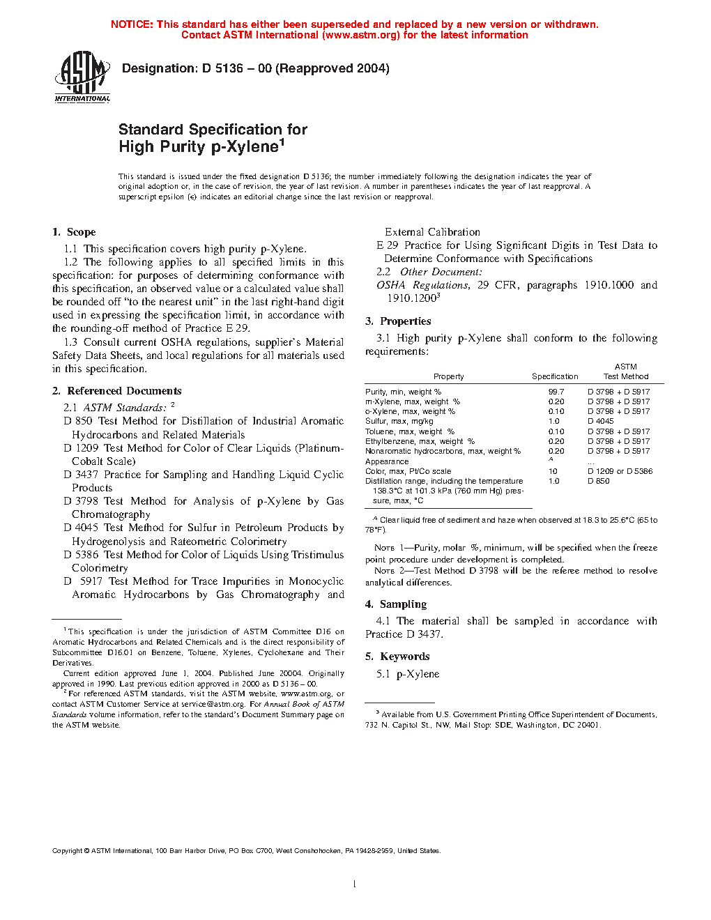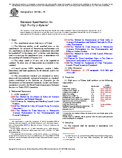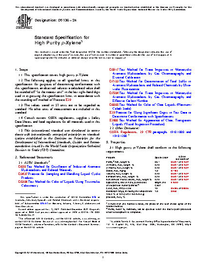 This specification establishes the requirements for p-Xylene. Sampled specimens shall conform to the following physical and chemical properties: minimum purity; maximum m-Xylene content; maximum o-Xylene content; maximum sulfur content; maximum toluene content; maximum ethylbenzene content; maximum nonaromatic hydrocarbons content; appearance; color (Pt/Co scale); distillation range; and maximum pressure.