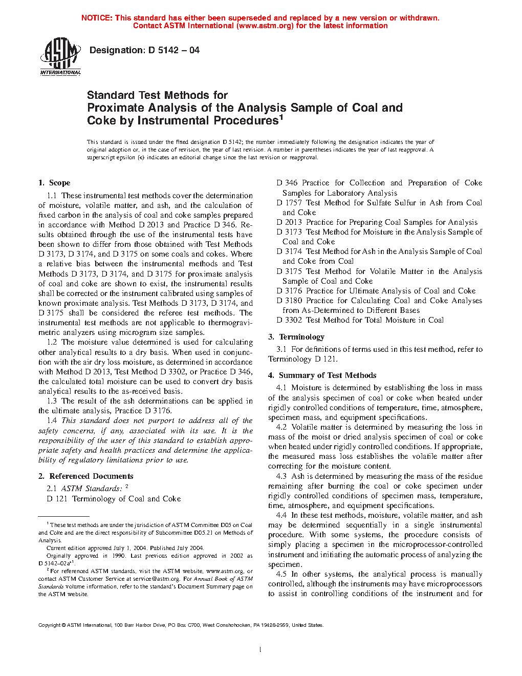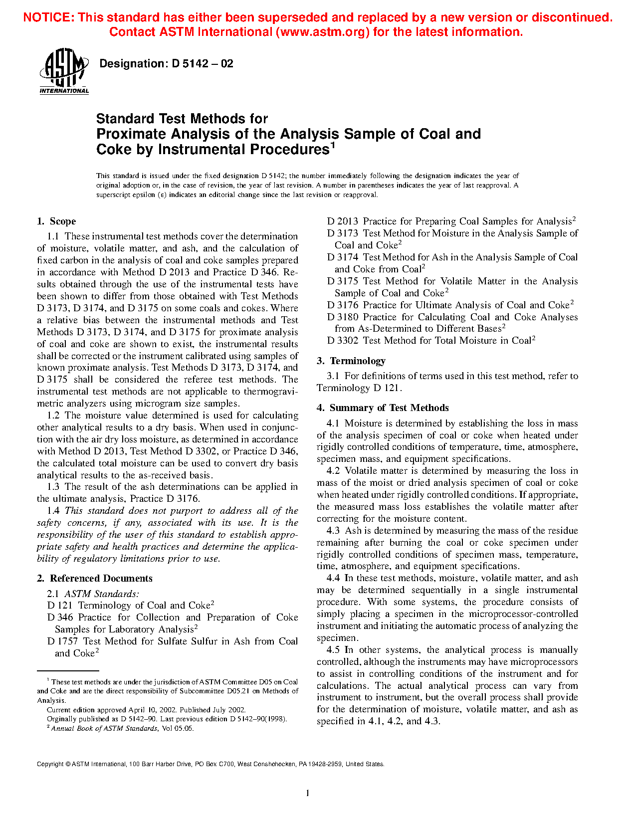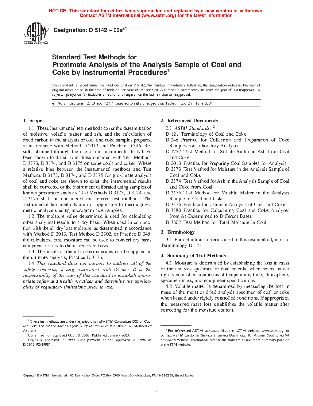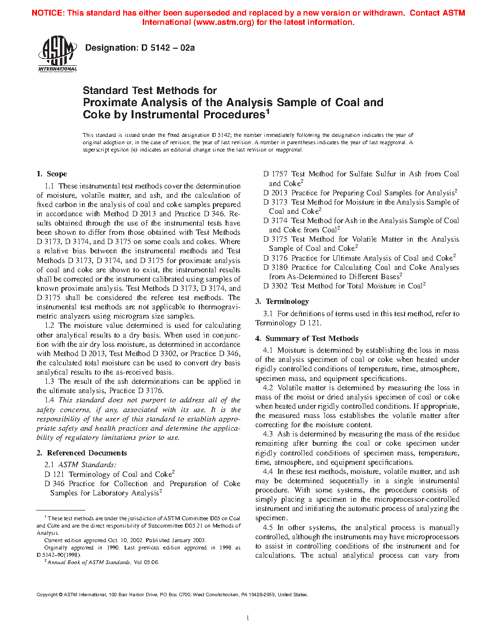 1.1 These instrumental test methods cover the determination of moisture, volatile matter, and ash, and the calculation of fixed carbon in the analysis of coal and coke samples prepared in accordance with Method D 2013 and Practice D 346. Results obtained through the use of the instrumental tests have been shown to differ from those obtained with Test Methods D 3173, D 3174, and D 3175 on some coals and cokes. Where a relative bias between the instrumental methods and Test Methods D 3173, D 3174, and D 3175 for proximate analysis of coal and coke are shown to exist, the instrumental results shall be corrected or the instrument calibrated using samples of known proximate analysis. Test Methods D 3173, D 3174, and D 3175 shall be considered the referee test methods. The instrumental test methods are not applicable to thermogravimetric analyzers using microgram size samples.
