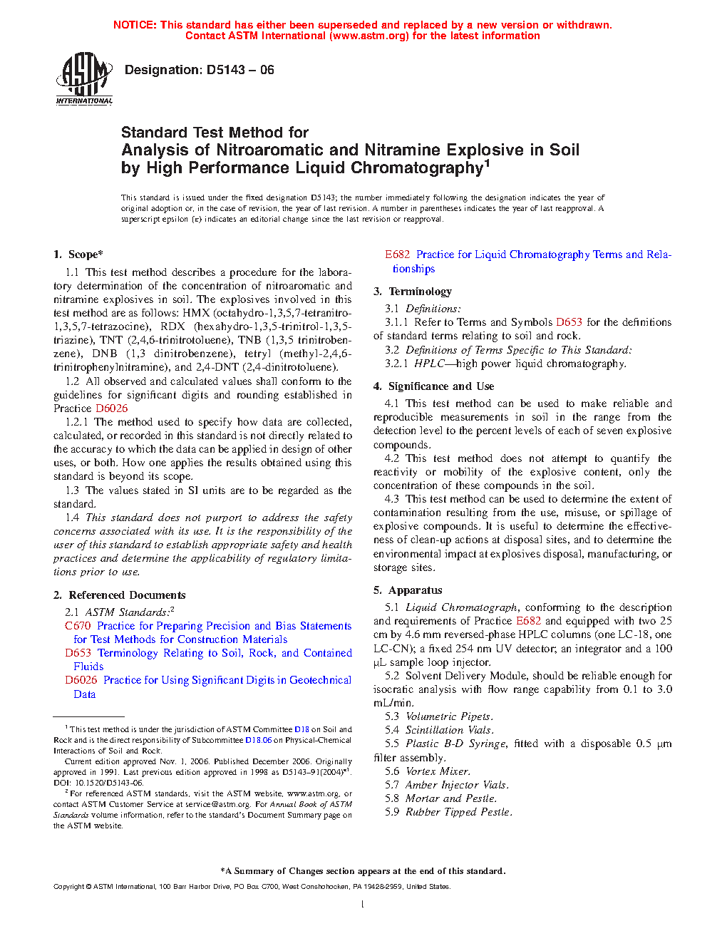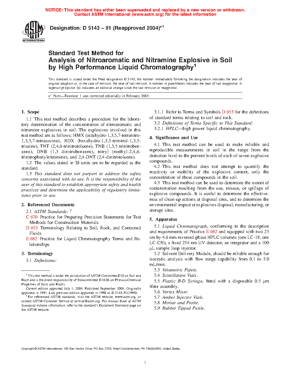 1.1 This test method describes a procedure for the laboratory determination of the concentration of nitroaromatic and nitramine explosives in soil. The explosives involved in this test method are as follows: HMX (octahydro-1,3,5,7-tetranitro-1,3,5,7-tetrazocine), RDX (hexahydro-1,3,5-trinitrol-1,3,5-triazine), TNT (2,4,6-trinitrotoluene), TNB (1,3,5 trinitrobenzene), DNB (1,3 dinitrobenzene), tetryl (methyl-2,4,6-trinitrophenylnitramine), and 2,4-DNT (2,4-dinitrotoluene).