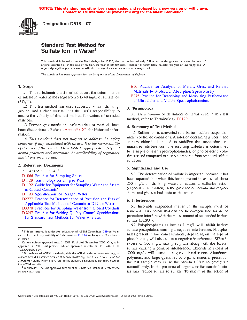 1.1 This turbidimetric test method covers the determination of sulfate in water in the range from 5 mg/L to 40 mg/L of sulfate ion (SO4--).