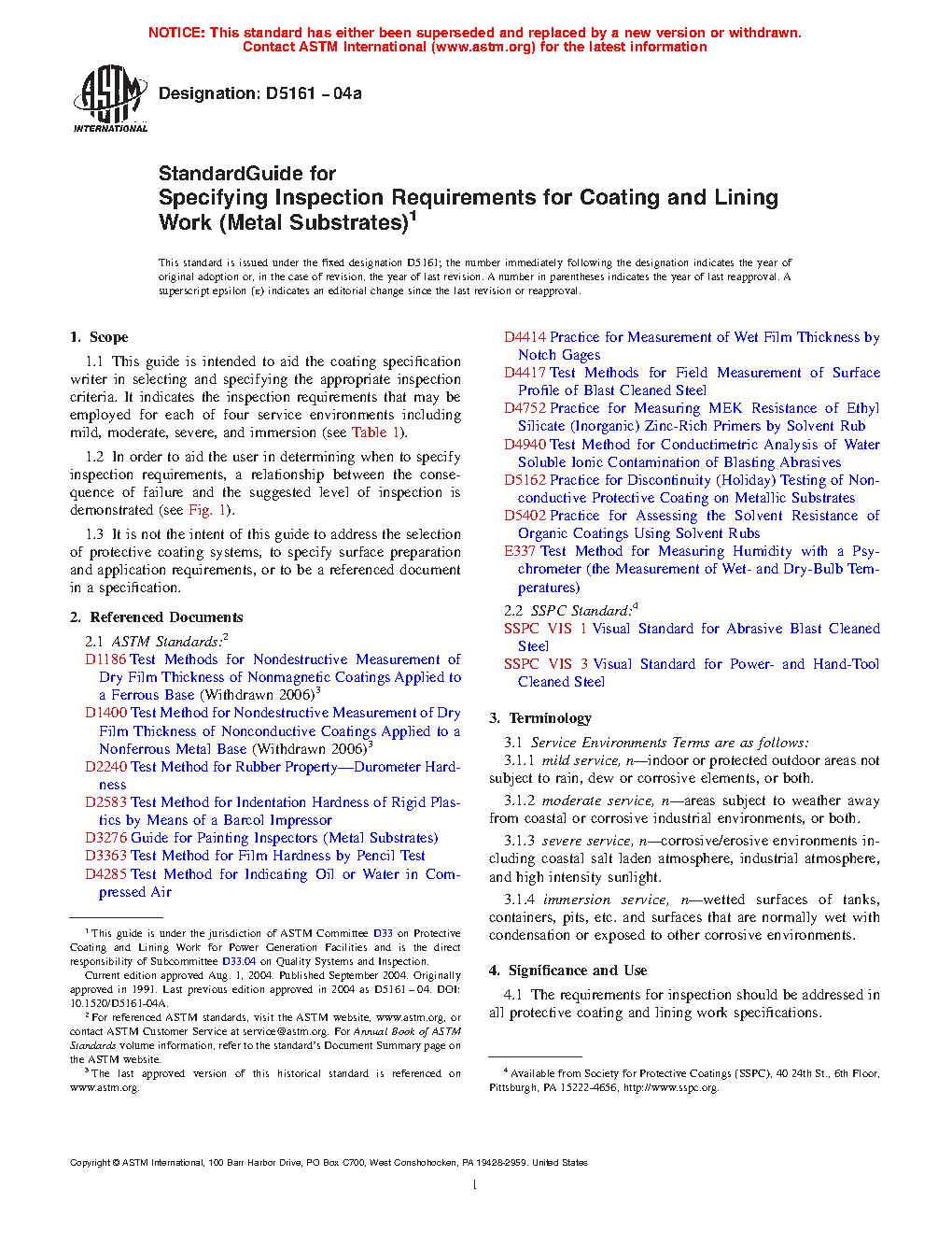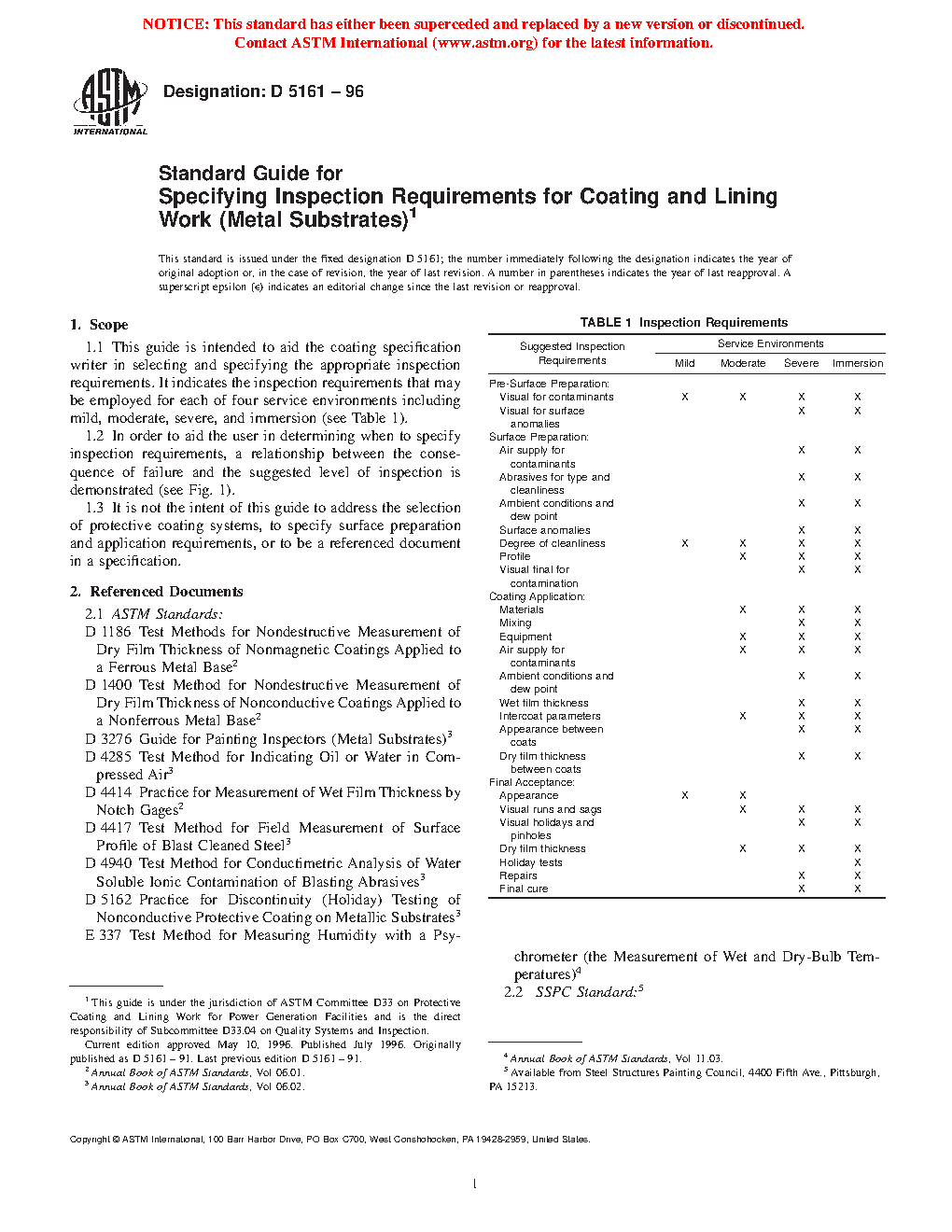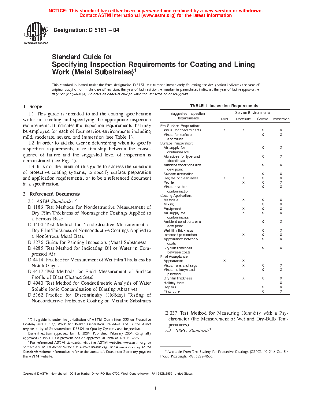1.1 This guide is intended to aid the coating specification writer in selecting and specifying the appropriate inspection requirements. It indicates the inspection requirements that may be employed for each of four service environments including mild, moderate, severe, and immersion (see Table 1).