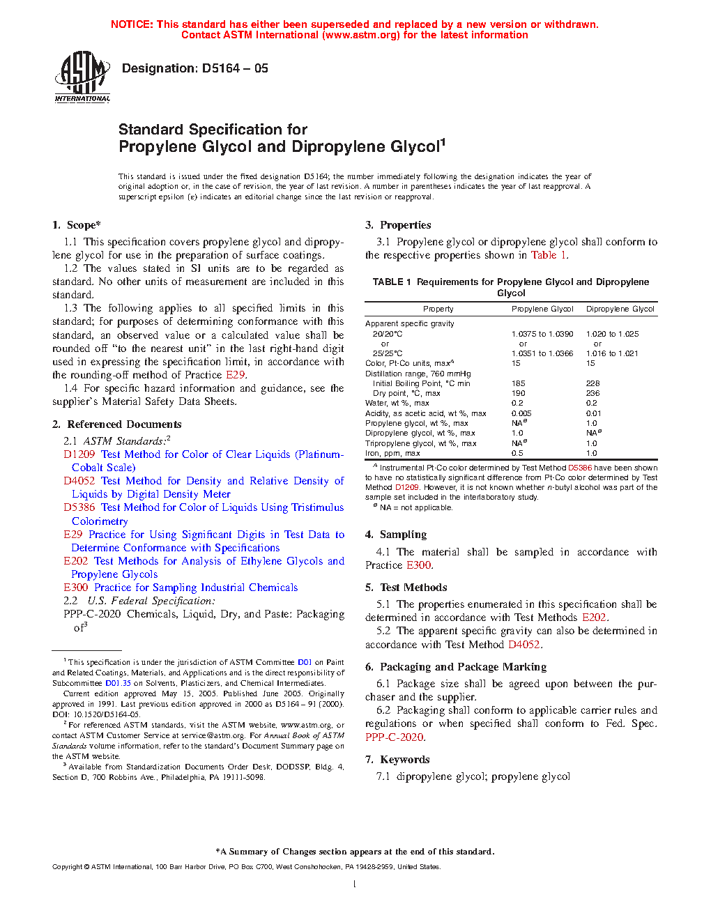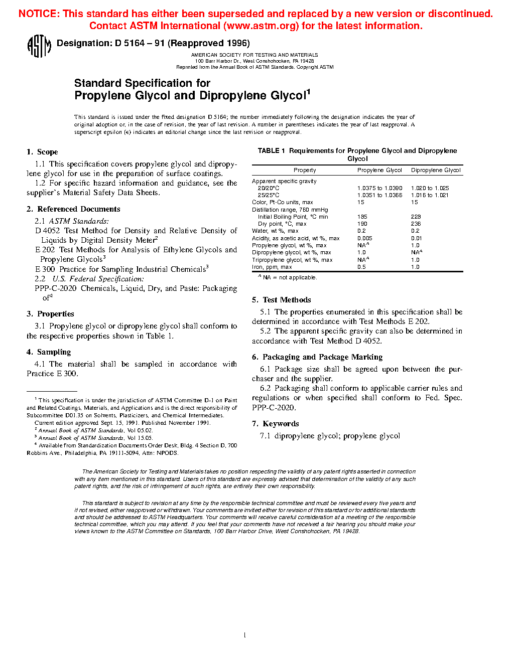 This specification covers propylene glycol and dipropylene glycol for use in the preparation of surface coatings. The material properties enumerated, and apparent specific gravity shall be tested to meet the requirements prescribed.