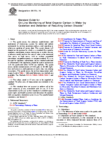 1.1 This guide covers the selection, establishment, and application of monitoring systems for carbon and carbon compounds by on-line, automatic analysis, and recording or otherwise signaling of output data. The system chosen will depend on the purpose for which it is intended (for example, regulatory compliance, process monitoring, or to alert the user to adverse trends) and on the type of water to be monitored (low purity or high purity, with or without suspended particulates, purgeable organics, or inorganic carbon). If it is to be used for regulatory compliance, the test method published or referenced in the regulations should be used in conjunction with this guide and other ASTM test methods. This guide covers carbon concentrations of 0.05 µg/L to 50 000 mg/L. Low end sensitivity and quantitative results may vary among instruments. This guide covers the on-line measurement techniques listed in Table 1. Additional laboratory test methods are available: Test Methods D4129, D4839, D5904, D6317, and D7573.