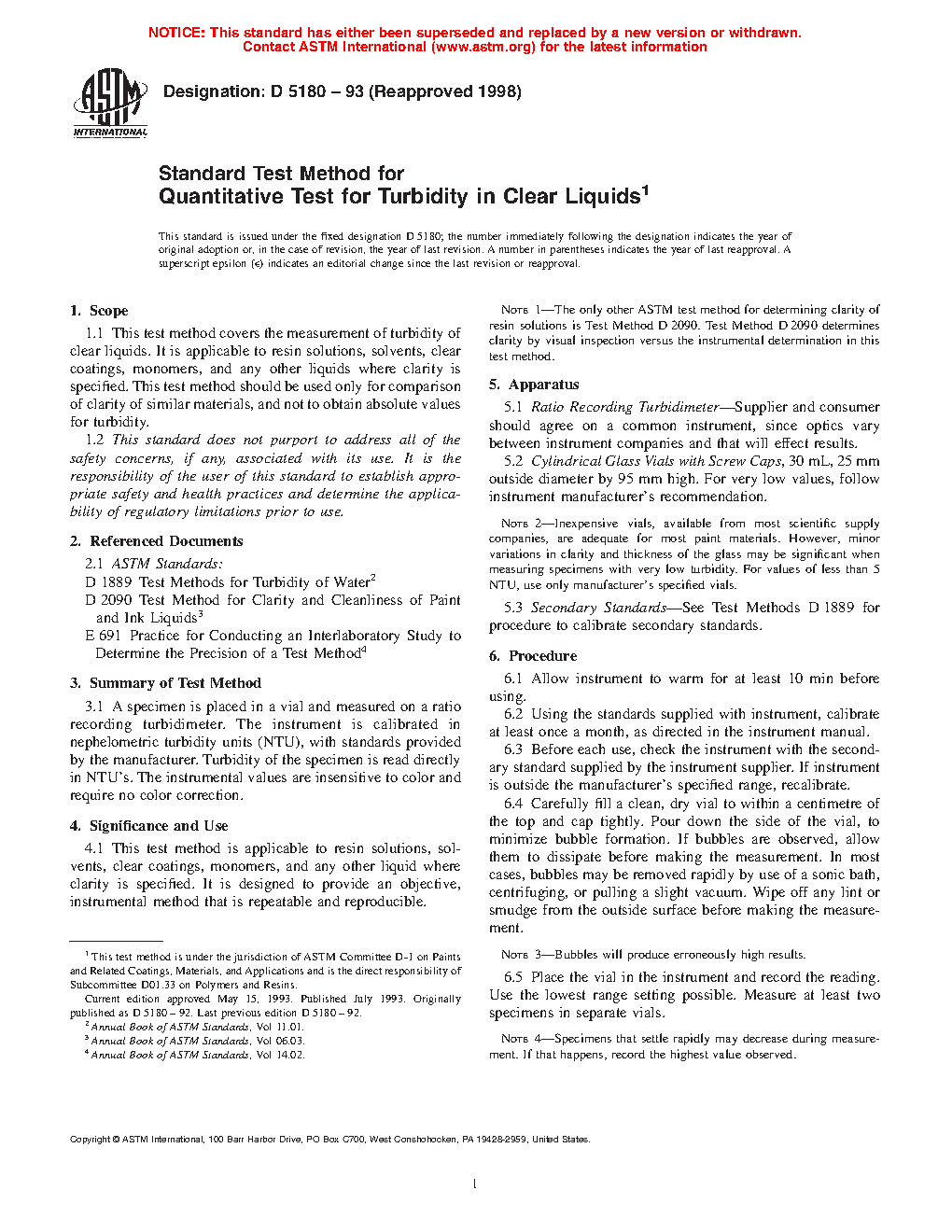 1.1 This test method covers the measurement of turbidity of clear liquids. It is applicable to resin solutions, solvents, clear coatings, monomers, and any other liquids where clarity is specified. This test method should be used only for comparison of clarity of similar materials, and not to obtain absolute values for turbidity.