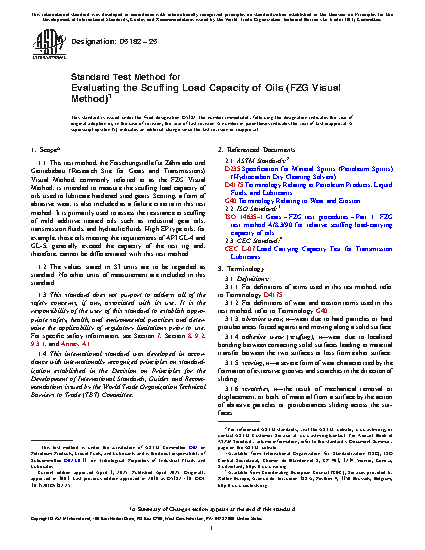 1.1 This test method, the Forschungstelle für Záhnräder und Getriebebau (Research Site for Gears and Transmissions) Visual Method, commonly referred to as the FZG Visual Method, is intended to measure the scuffing load capacity of oils used to lubricate hardened steel gears. Scoring, a form of abrasive wear, is also included as a failure criteria in this test method. It is primarily used to assess the resistance to scuffing of mild additive treated oils such as industrial gear oils, transmission fluids, and hydraulic fluids. High EP type oils, for example, those oils meeting the requirements of API GL-4 and GL-5, generally exceed the capacity of the test rig and, therefore, cannot be differentiated with this test method.