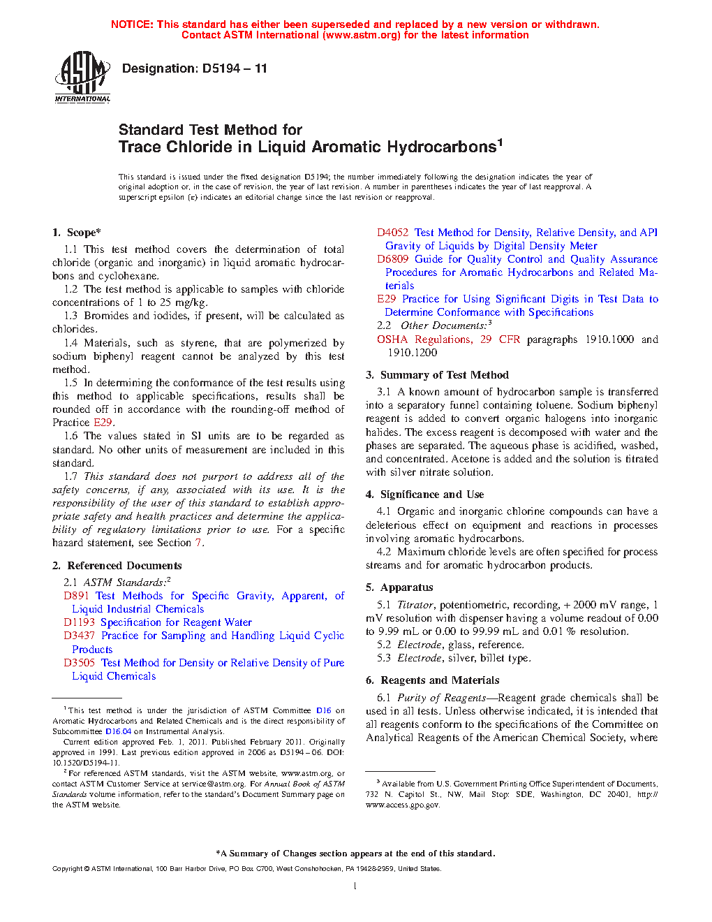 1.1 This test method covers the determination of total chloride (organic and inorganic) in liquid aromatic hydrocarbons and cyclohexane.
