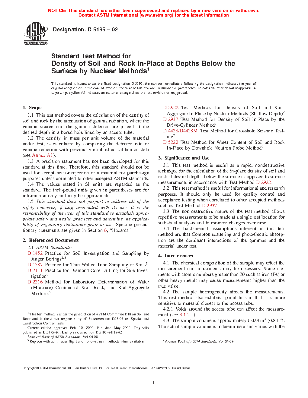 5.1 This test method is useful as a rapid, nondestructive technique for the calculation of the in-place density of soil and rock at desired depths below the surface as opposed to surface measurements in accordance with Test Method D6938. Alternative destructive methods are likewise described in this test method.