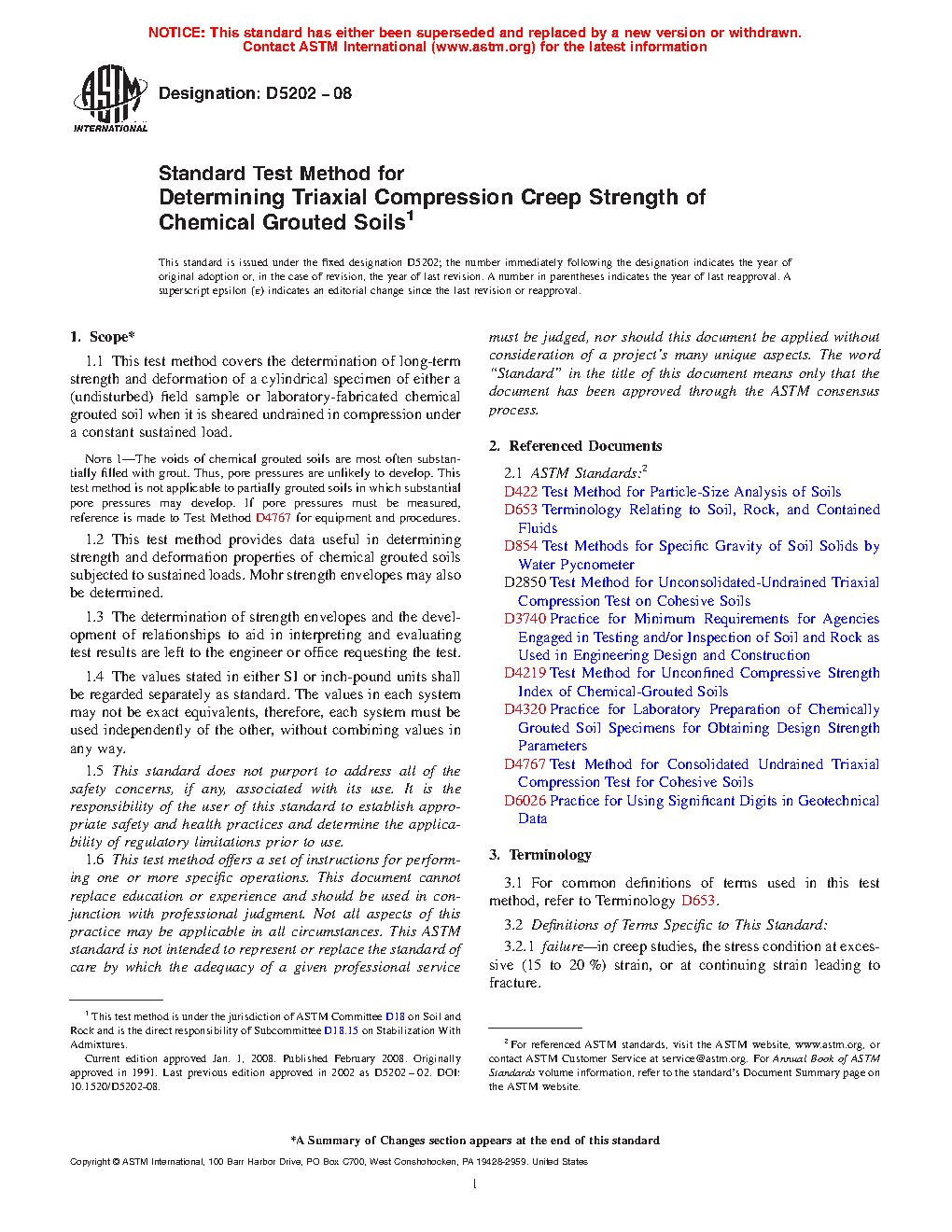 Note 1: The voids of chemical grouted soils are most often substantially filled with grout. Thus, pore pressures are unlikely to develop. This test method is not applicable to partially grouted soils in which substantial pore pressures may develop. If pore pressures must be measured, reference is made to Test Method D4767 for equipment and procedures.