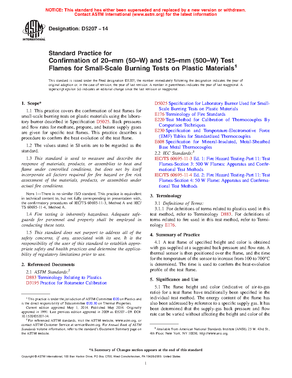 1.1 This practice covers the calibration of test flames for small-scale burning tests on plastic materials using the laboratory burner described in Specification D5025. Back pressures and flow rates for methane, propane, and butane supply gases are given for specific test flames. This practice describes a procedure to confirm the heat evolution of the test flame.