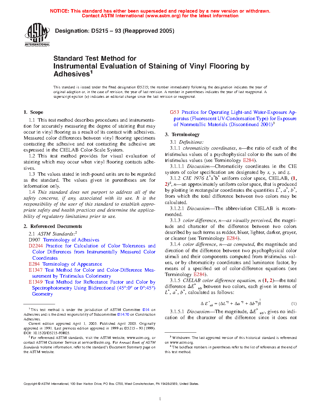 1.1 This test method describes procedures and instrumentation for accurately measuring the degree of staining that may occur in vinyl flooring as a result of its contact with adhesives. Measured color differences between vinyl flooring specimens contacting the adhesive and not contacting the adhesive are expressed in the CIELAB Color-Scale System.