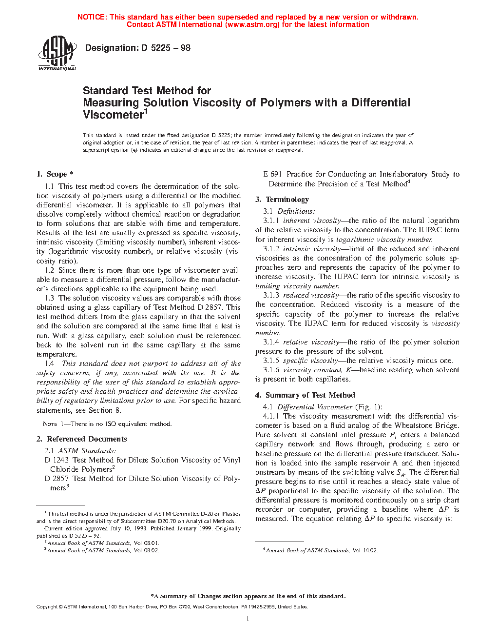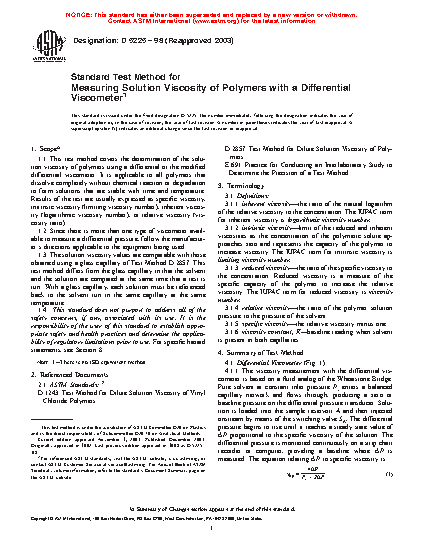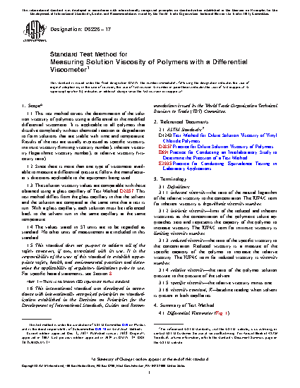 1.1 This test method covers the determination of the solution viscosity of polymers using a differential or the modified differential viscometer. It is applicable to all polymers that dissolve completely without chemical reaction or degradation to form solutions that are stable with time and temperature. Results of the test are usually expressed as specific viscosity, intrinsic viscosity (limiting viscosity number), inherent viscosity (logarithmic viscosity number), or relative viscosity (viscosity ratio).