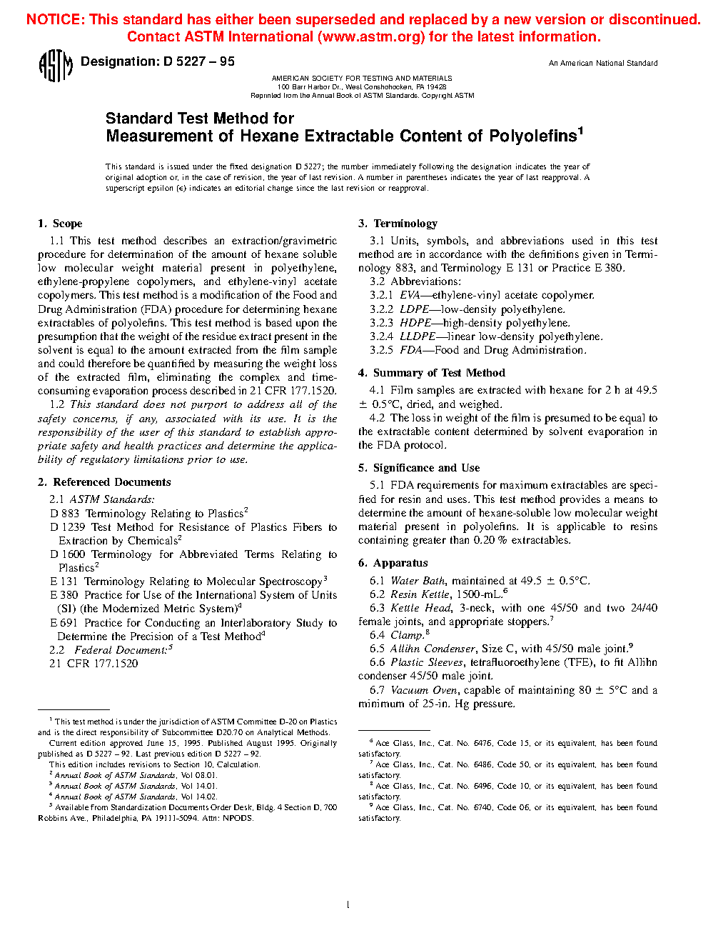 5.1 FDA requirements for maximum extractables are specified for resin and uses. This test method provides a means to determine the amount of hexane-soluble low molecular weight material present in polyolefins. It is applicable to resins containing greater than 0.20 % extractables.