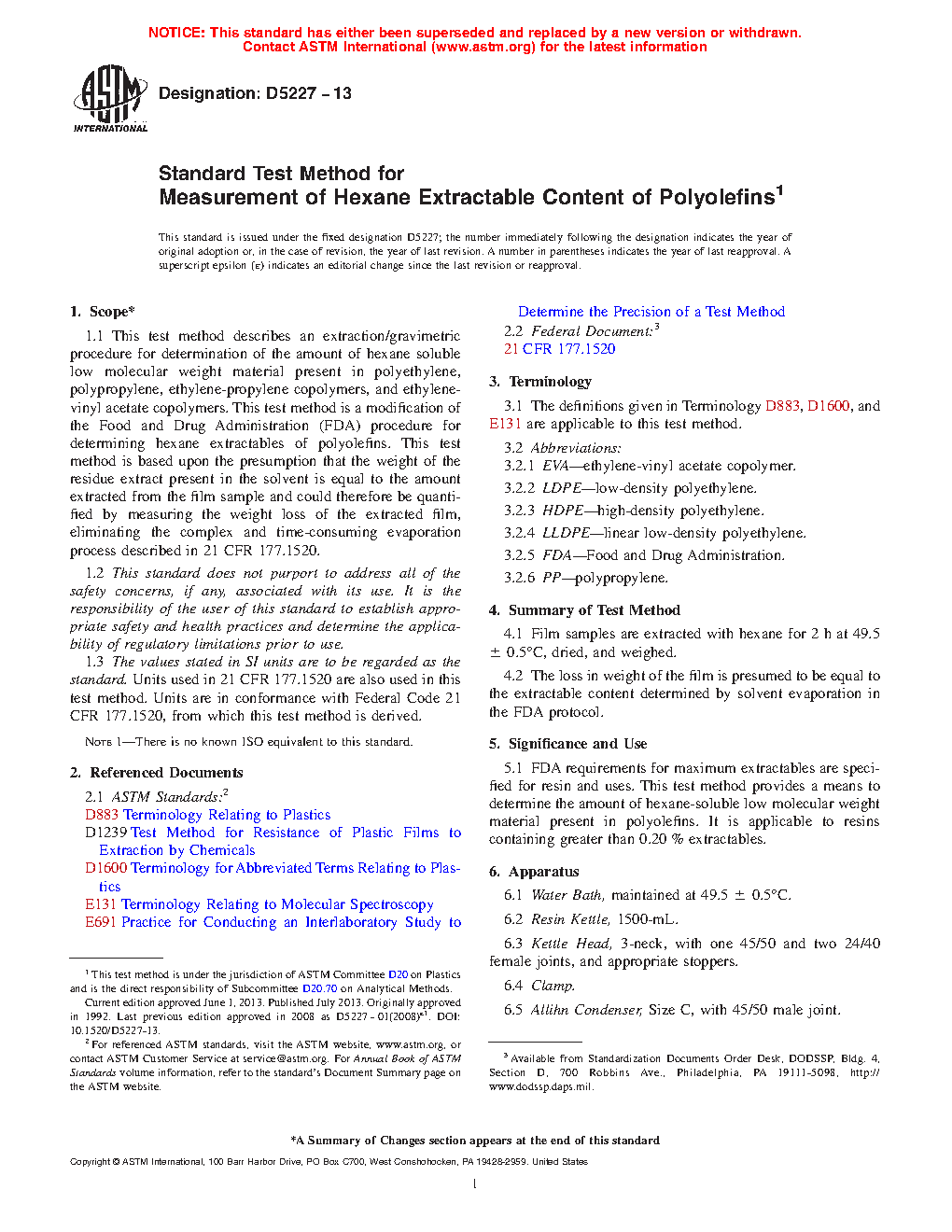 1.1 This test method describes an extraction/gravimetric procedure for determination of the amount of hexane soluble low molecular weight material present in polyethylene, polypropylene, ethylene-propylene copolymers, and ethylene-vinyl acetate copolymers. This test method is a modification of the Food and Drug Administration (FDA) procedure for determining hexane extractables of polyolefins. This test method is based upon the presumption that the weight of the residue extract present in the solvent is equal to the amount extracted from the film sample and could therefore be quantified by measuring the weight loss of the extracted film, eliminating the complex and time-consuming evaporation process described in 21 CFR 177.1520.