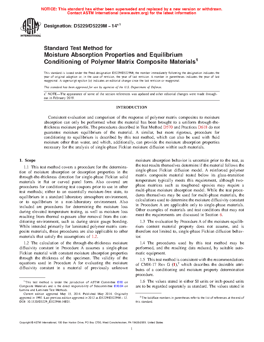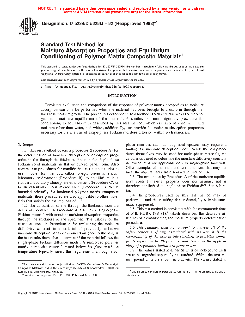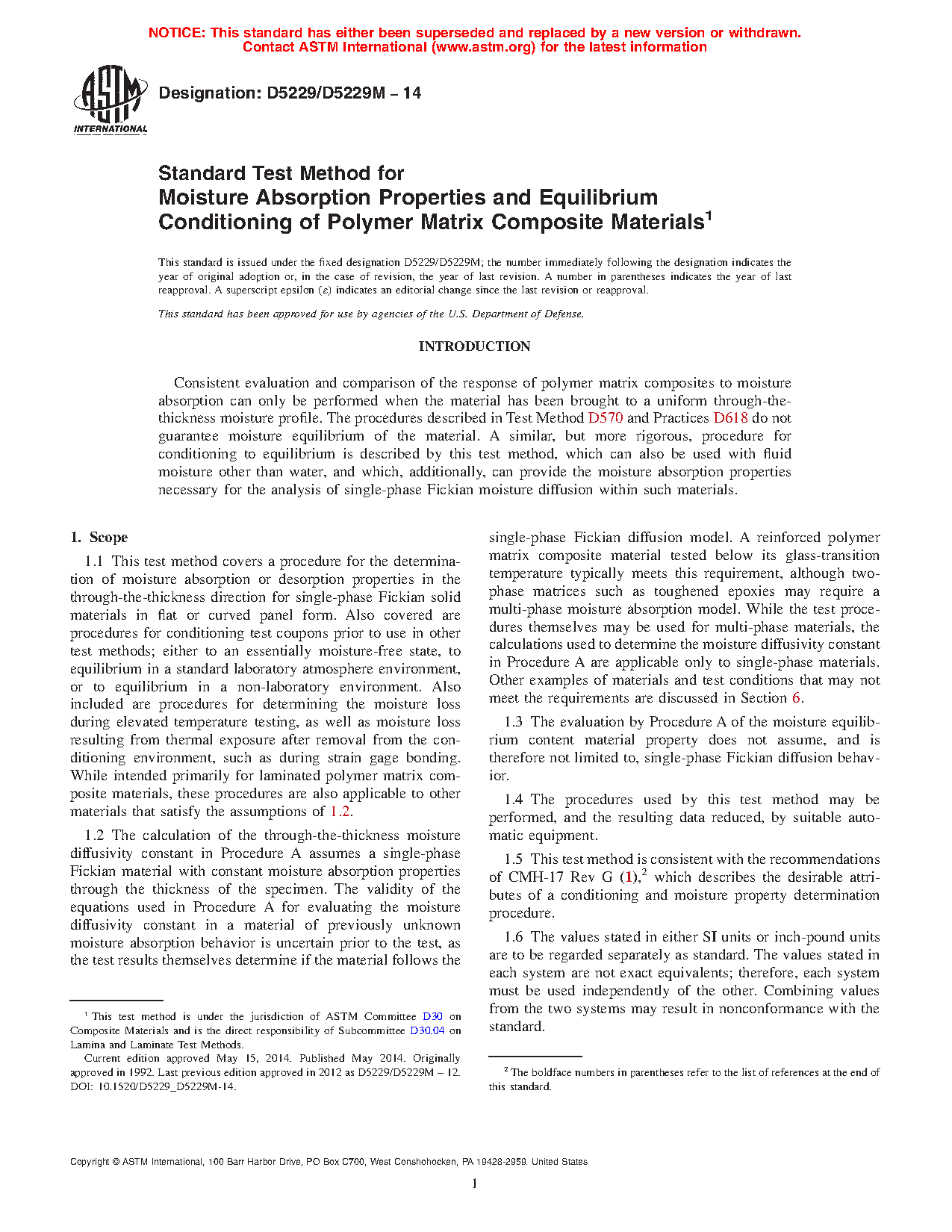 1.1 This test method covers a procedure for the determination of moisture absorption or desorption properties in the through-the-thickness direction for single-phase Fickian solid materials in flat or curved panel form. Also covered are procedures for conditioning test coupons prior to use in other test methods; either to an essentially moisture-free state, to equilibrium in a standard laboratory atmosphere environment, or to equilibrium in a non-laboratory environment. Also included are procedures for determining the moisture loss during elevated temperature testing, as well as moisture loss resulting from thermal exposure after removal from the conditioning environment, such as during strain gage bonding. While intended primarily for laminated polymer matrix composite materials, these procedures are also applicable to other materials that satisfy the assumptions of 1.2.
