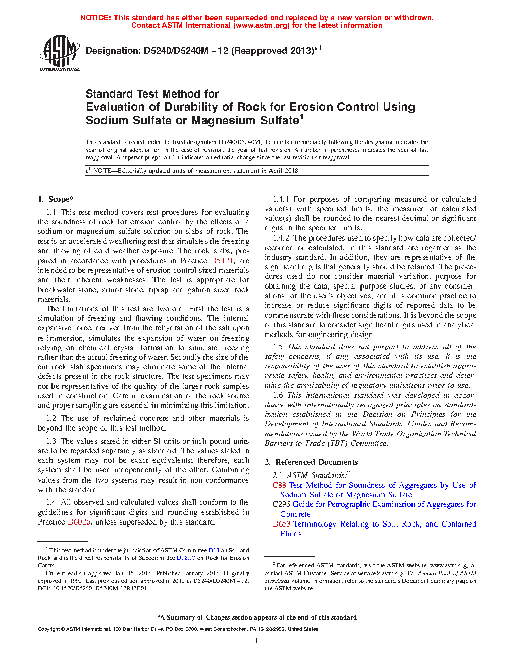 5.2 The sodium sulfate or magnesium sulfate soundness test is one method by which to estimate qualitatively the durability of rock under weathering conditions. This test method was developed to be used in conjunction with additional test methods listed in Practice D4992. This test method does not provide an absolute value, but rather an indication of the resistance to freezing and thawing; therefore, the results of this test method are not to be used as the sole basis for the determination of rock durability.