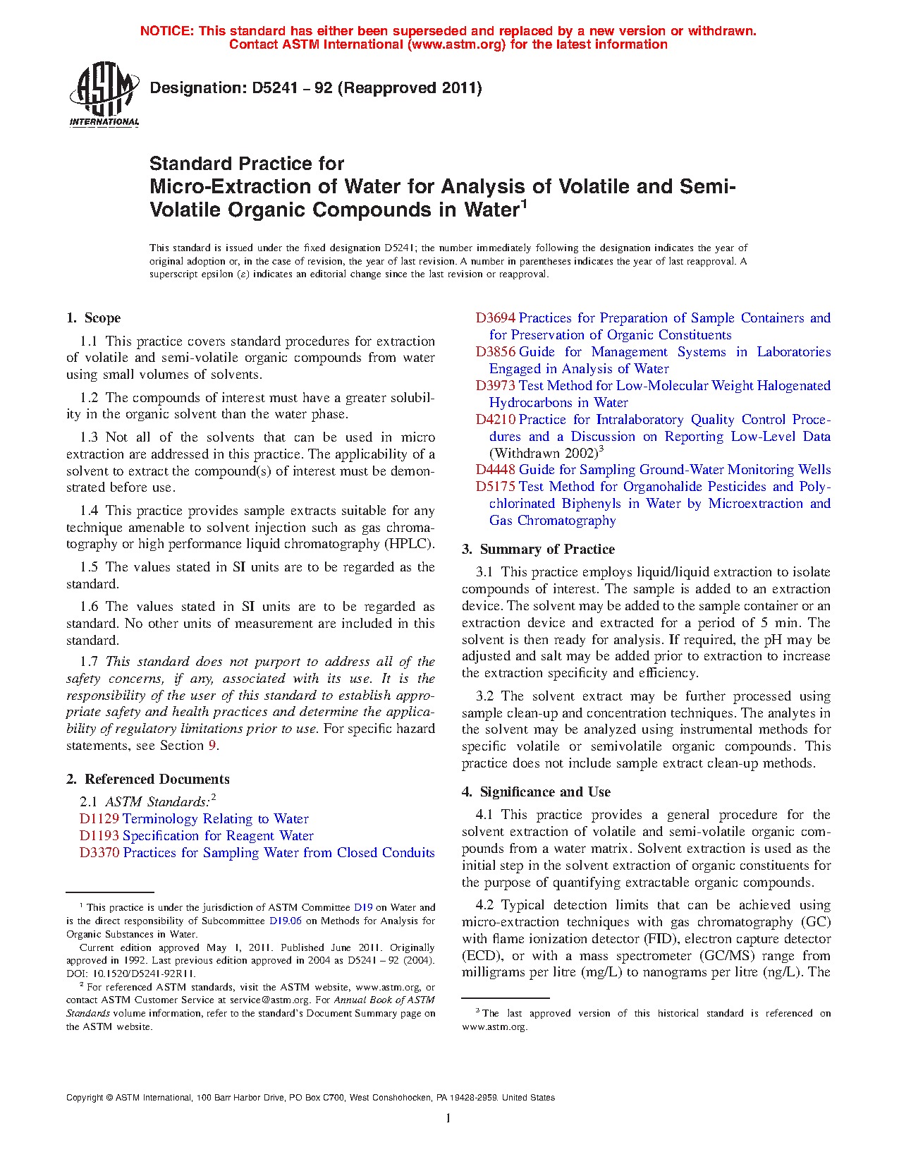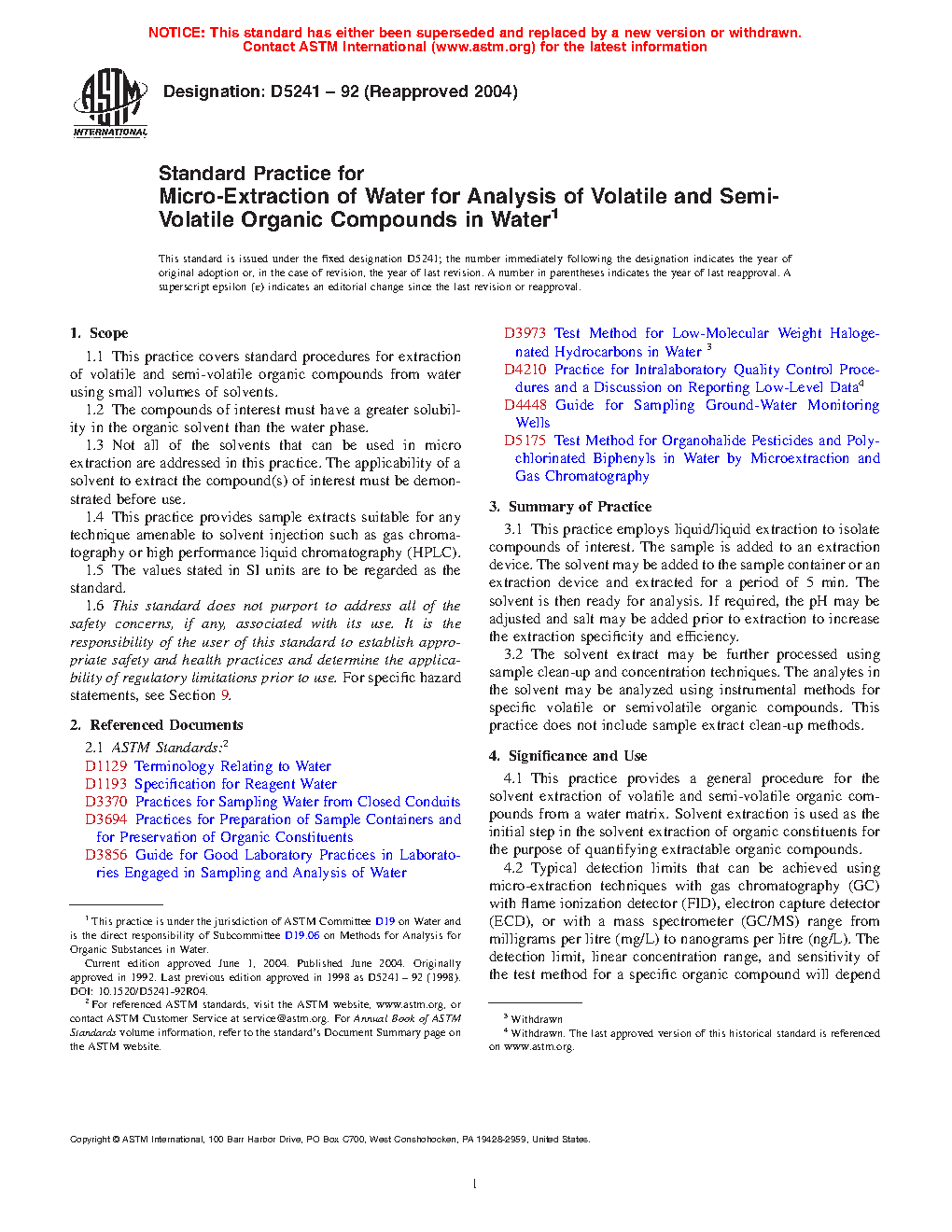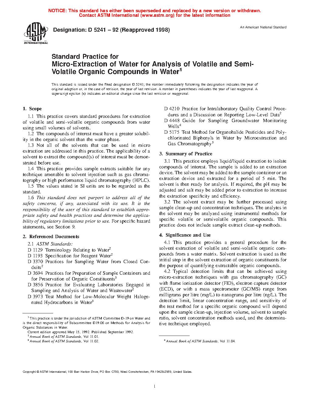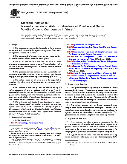 1.1 This practice covers standard procedures for extraction of volatile and semi-volatile organic compounds from water using small volumes of solvents.