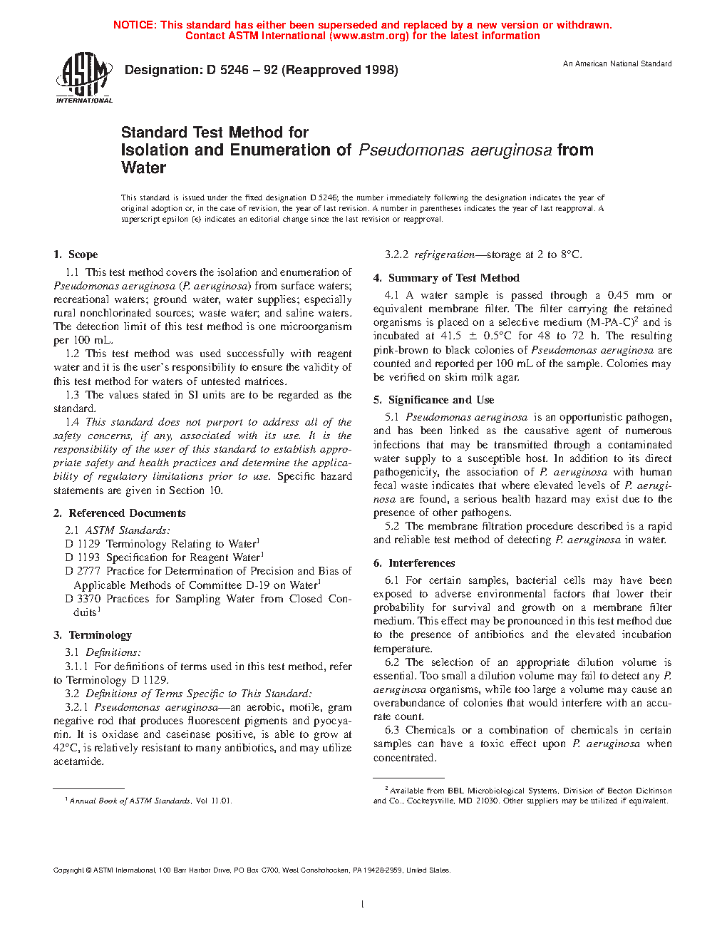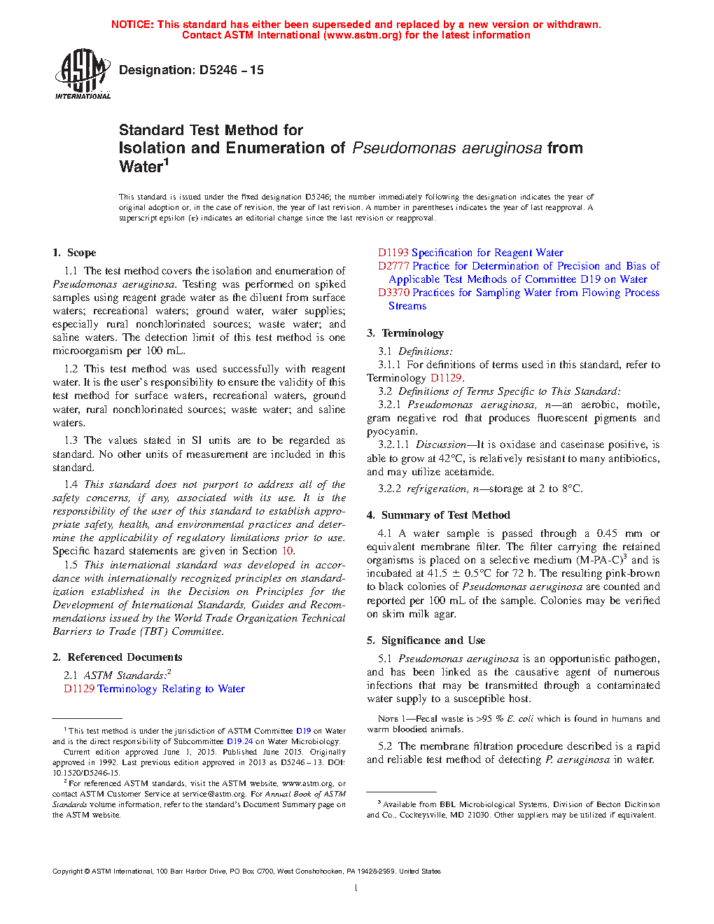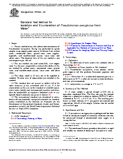 5.2 The membrane filtration procedure described is a rapid and reliable test method of detecting P. aeruginosa in water.