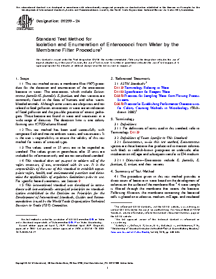 1.1 This test method covers a membrane filter (MF) procedure for the detection and enumeration of the enterococci bacteria in water. The enterococci, which include Entero-coccus faecalis (E. faecalis), E. faecium, and their varieties are commonly found in the feces of humans and other warm-blooded animals. Although some strains are ubiquitous and not related to fecal pollution, enterococci in water are an indication of fecal pollution and the possible presence of enteric pathogens. These bacteria are found in water and wastewater in a wide range of densities. The detection limit is one colony forming unit (CFU)/volume filtered.