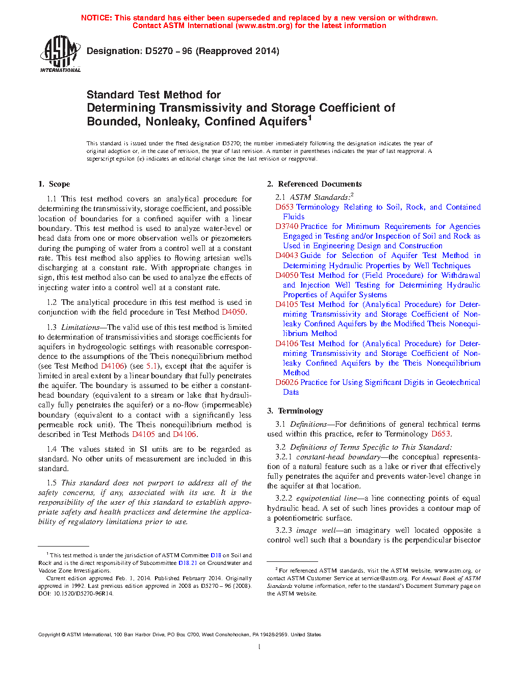 1.1 This test method covers an analytical procedure for determining the transmissivity, storage coefficient, and possible location of boundaries for a bounded confined aquifer. This test method is used to analyze water-level or head data from one or more observation wells or piezometers during the pumping of water from a control well at a constant rate. This test method also applies to flowing artesian wells discharging at a constant rate. With appropriate changes in sign, this test method also can be used to analyze the effects of injecting water into a control well at a constant rate.