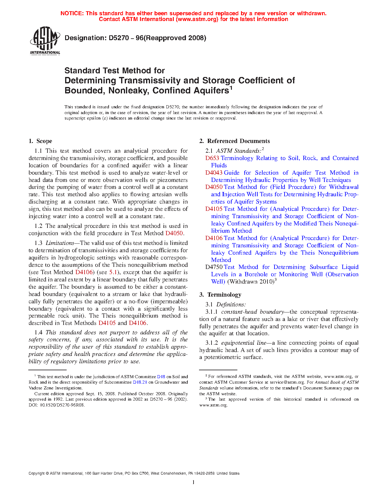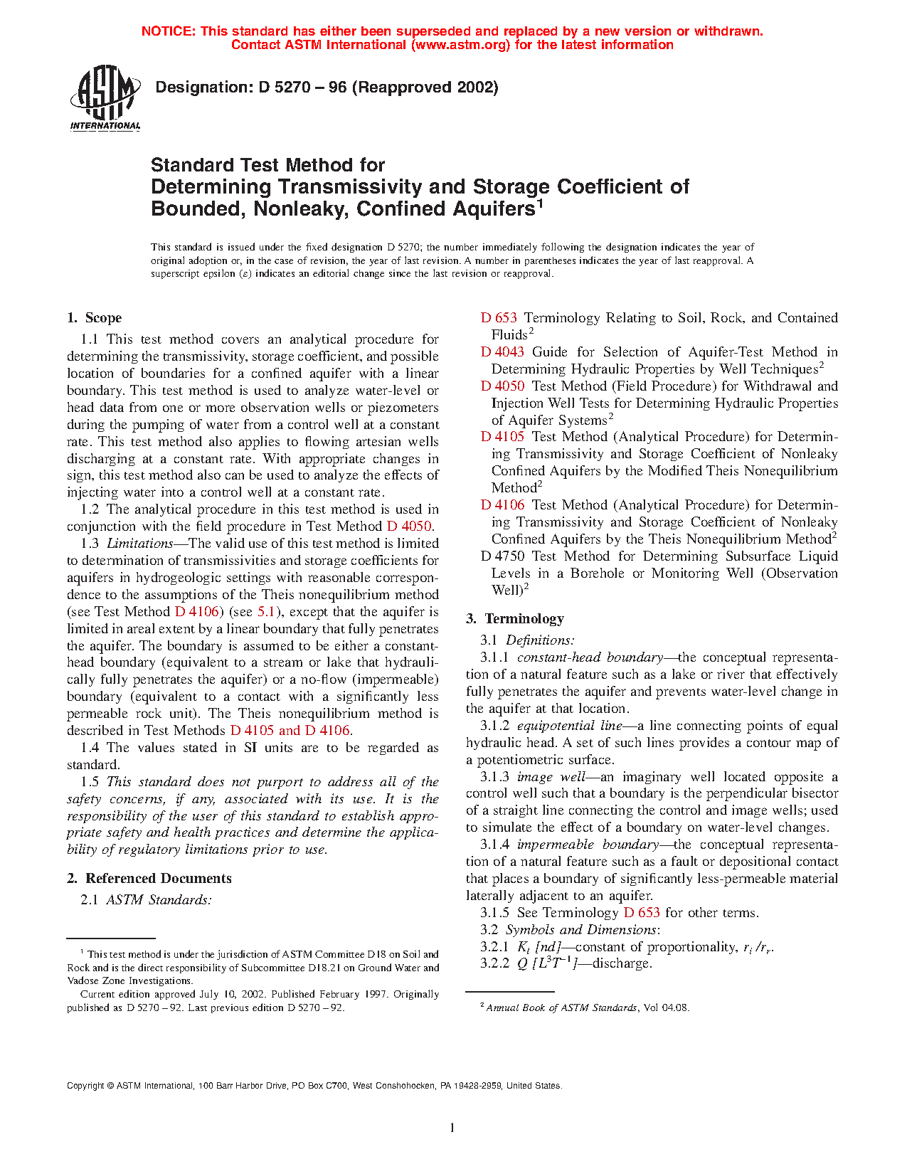 1.3 Limitations -The valid use of this test method is limited to determination of transmissivities and storage coefficients for aquifers in hydrogeologic settings with reasonable correspondence to the assumptions of the Theis nonequilibrium method (see Test Method D4106) (see 5.1), except that the aquifer is limited in areal extent by a linear boundary that fully penetrates the aquifer. The boundary is assumed to be either a constant-head boundary (equivalent to a stream or lake that hydraulically fully penetrates the aquifer) or a no-flow (impermeable) boundary (equivalent to a contact with a significantly less permeable rock unit). The Theis nonequilibrium method is described in Test Methods D 4105 and D 4106.