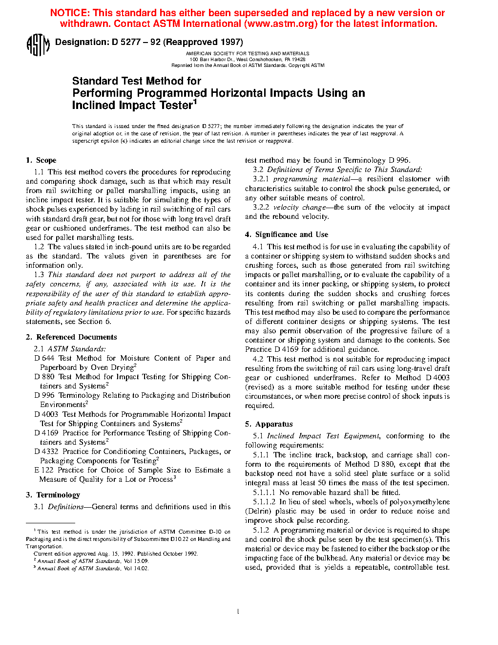 4.2 This test method is not suitable for reproducing impact resulting from the switching of rail cars using long-travel draft gear or cushioned underframes. Refer to Method D4003 (revised) as a more suitable method for testing under these circumstances, or when more precise control of shock inputs is required.
