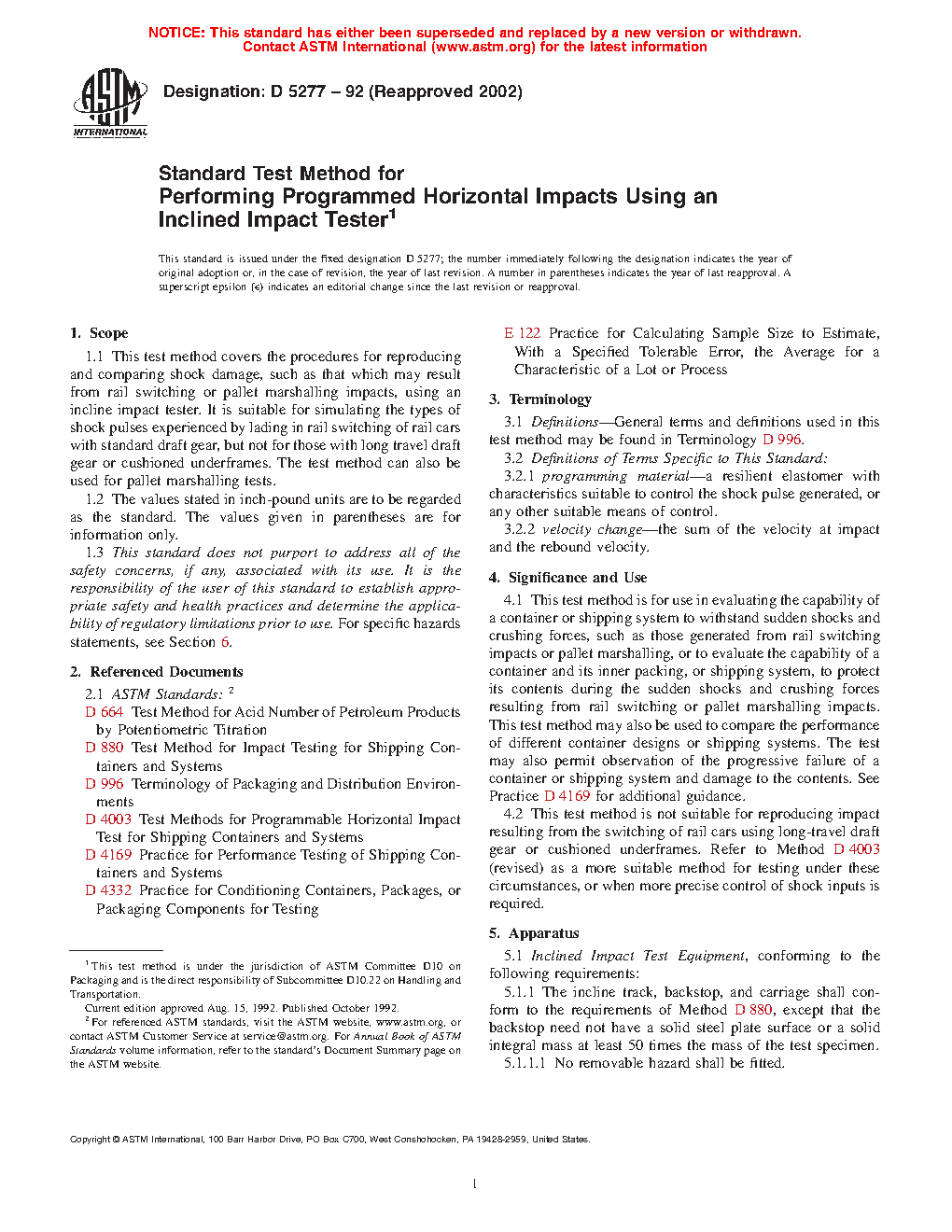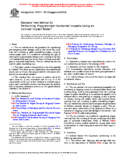 1.1 This test method covers the procedures for reproducing and comparing shock damage, such as that which may result from rail switching or pallet marshalling impacts, using an incline impact tester. It is suitable for simulating the types of shock pulses experienced by lading in rail switching of rail cars with standard draft gear, but not for those with long travel draft gear or cushioned underframes. The test method can also be used for pallet marshalling tests.