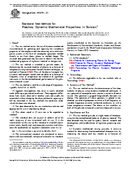 1.1 This test method covers the use of dynamic mechanical instrumentation for gathering and reporting the viscoelastic properties of thermoplastic and thermosetting resins and composite systems in the form of rectangular specimens molded directly or cut from sheets, plates, or molded shapes. The torsional data generated may be used to identify the thermomechanical properties of a plastics material or composition.