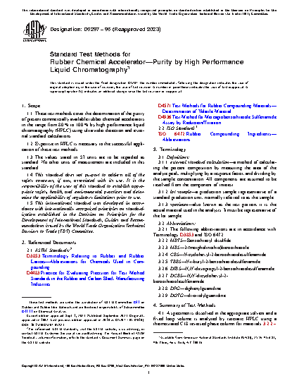 1.1 These test methods cover the determination of the purity of present commercially available rubber chemical accelerators in the range from 80 % to 100 % by high performance liquid chromatography (HPLC) using ultraviolet detection and external standard calculations.