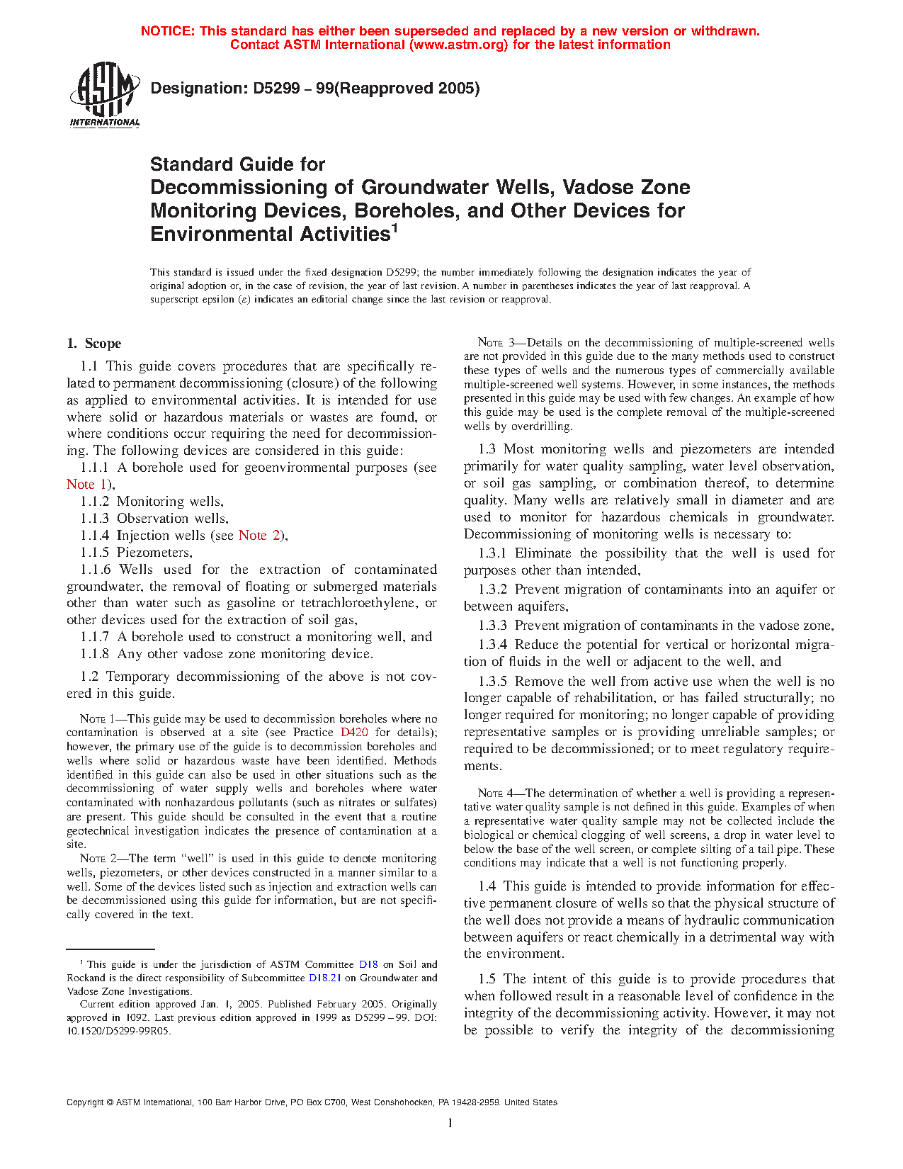 1.1 This guide covers procedures that are specifically related to permanent decommissioning (closure) of the following as applied to environmental activities. It is intended for use where solid or hazardous materials or wastes are found, or where conditions occur requiring the need for decommissioning. The following devices are considered in this guide: